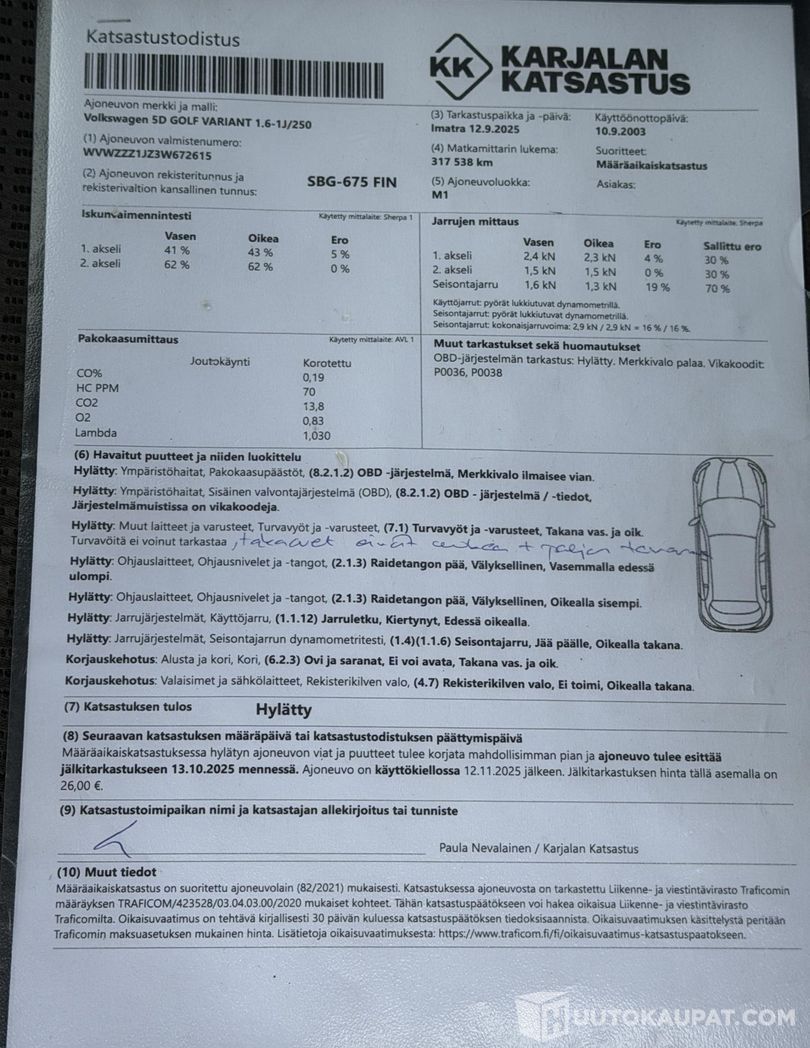 Kohteessa on havaittu muutoksia moottorin ohjelmoinnissa tai pakokaasujärjestelmissä, minkä vuoksi se ei ole liikennekelpoinen. Ostaja vastaa ajoneuvon korjaamisesta tieliikennekelpoiseksi omalla kustannuksellaan. Täsmennys: Todennäköisesti ei ole, mutta ei voi olla varma