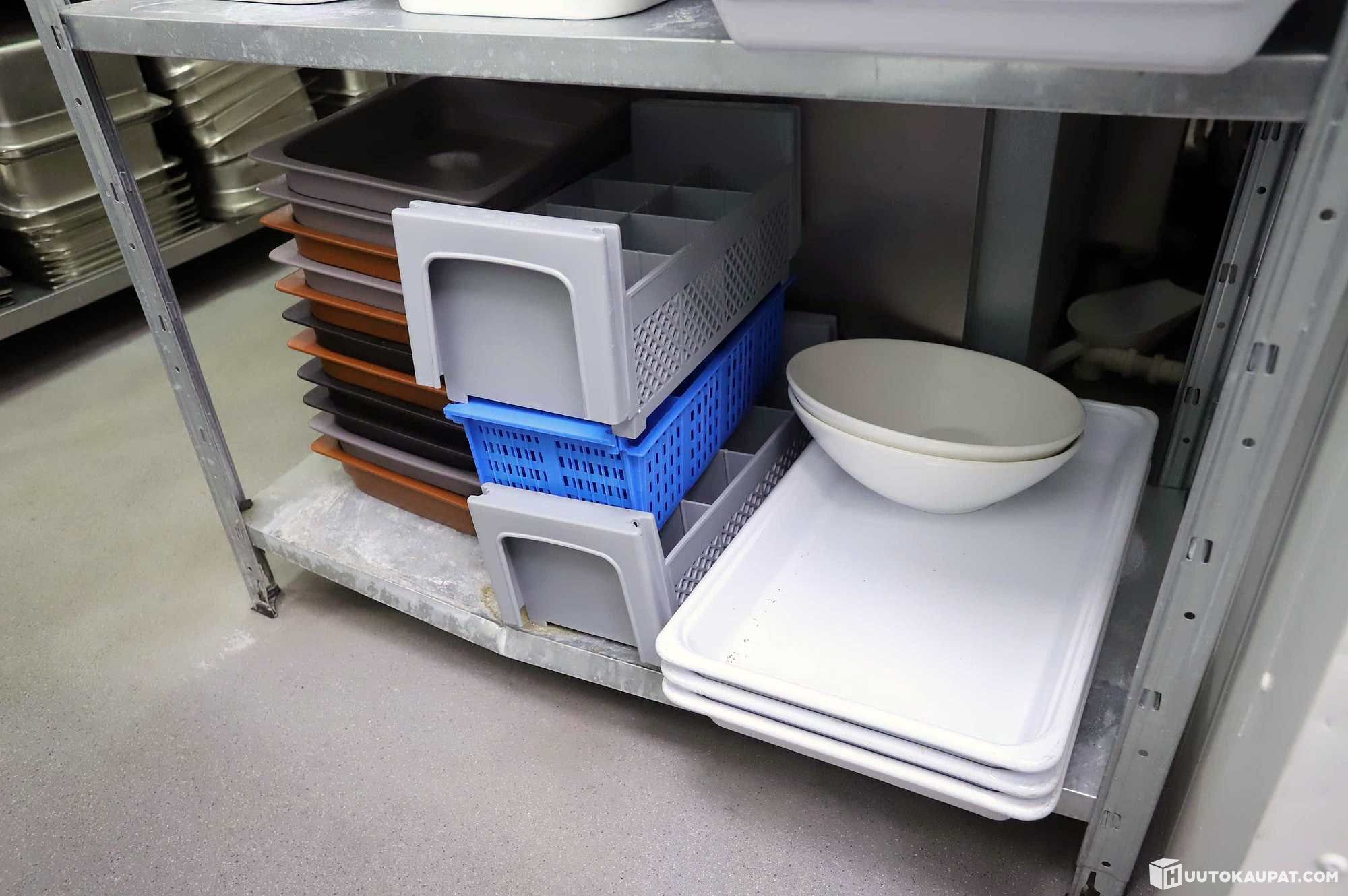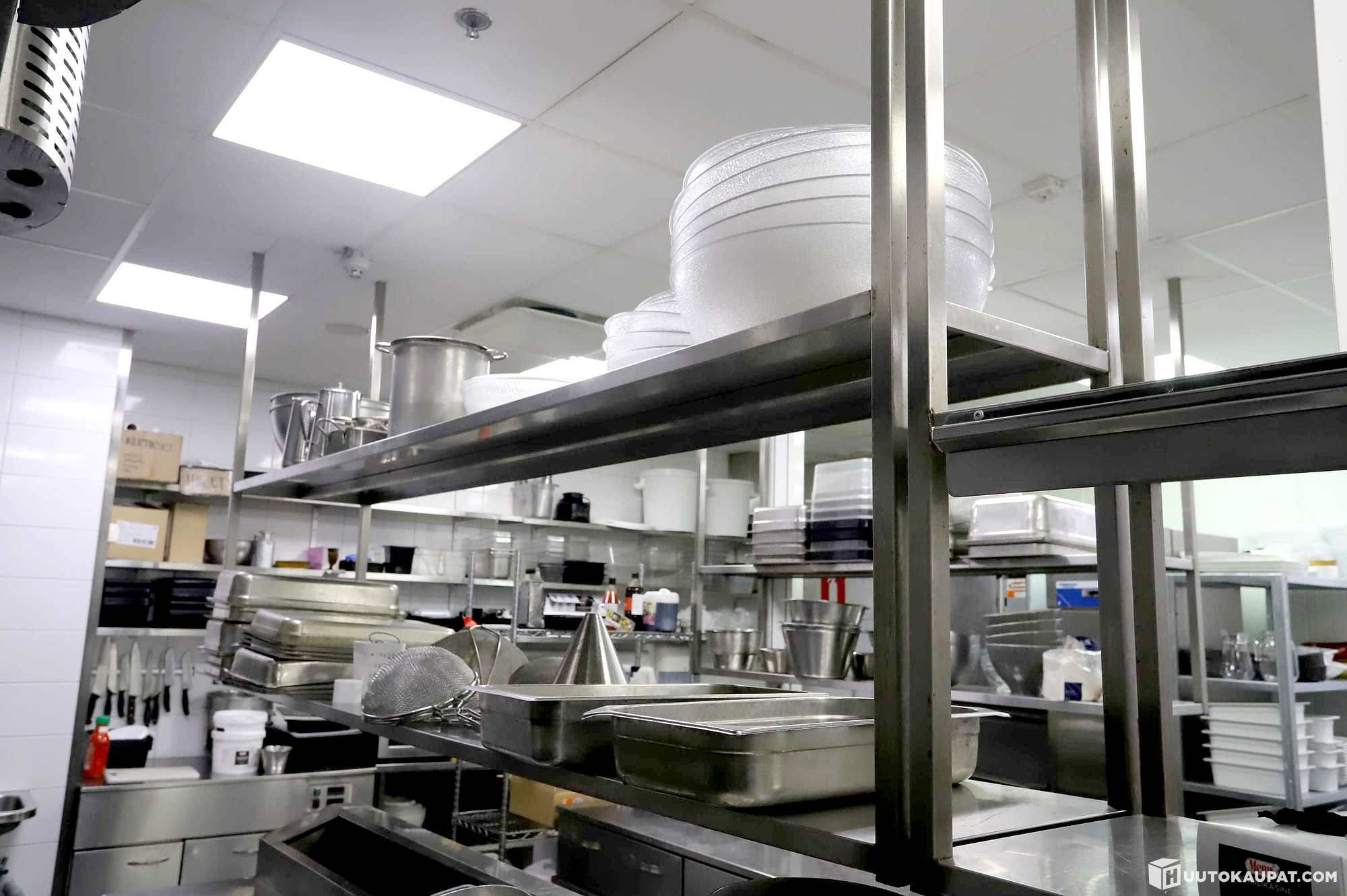 Huutoon kuuluu kuvissa näkyvät astiat, kattilat, veitset, siivilät ja muu pientavara, paitsi GN-vuoat ja sähkölaitteet eivät kuulu huutoon.