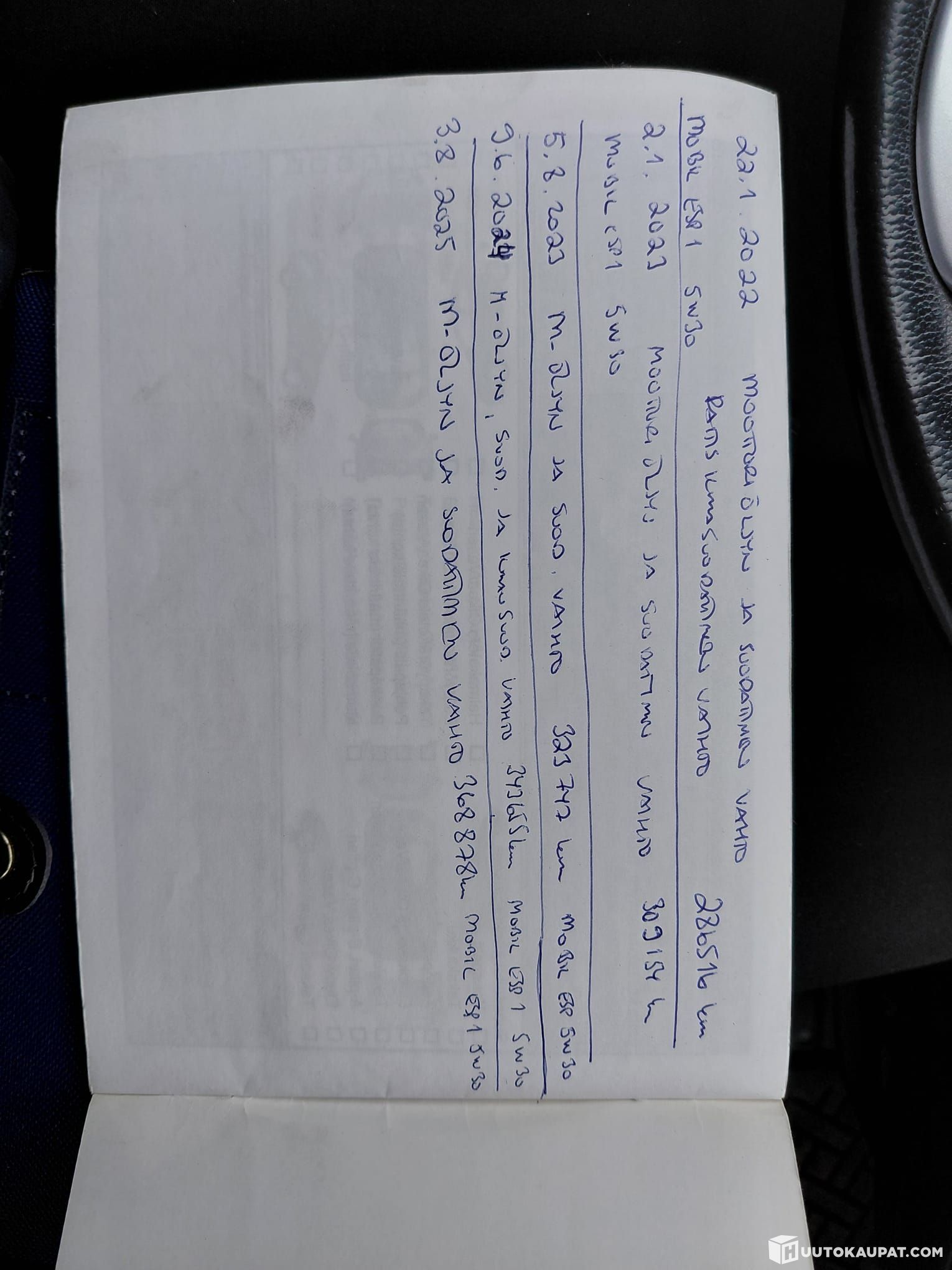 Leimaa on jäljellä ensi vuoden syyskuulle asti, joten siitä ei tarvitse hetkeen huolehtia. Huoltovihkosta löytyy kaikki merkinnät, viimeisin öljynvaihto elokuussa 2025.