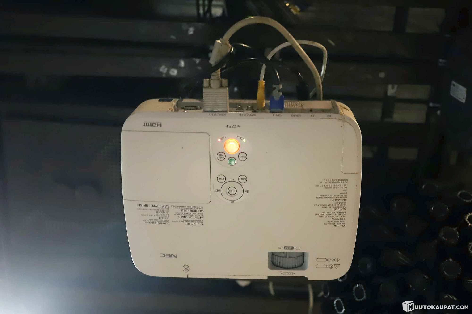 NEC M271W lcd-projektori kaukosäätimellä ja valkokankaalla.