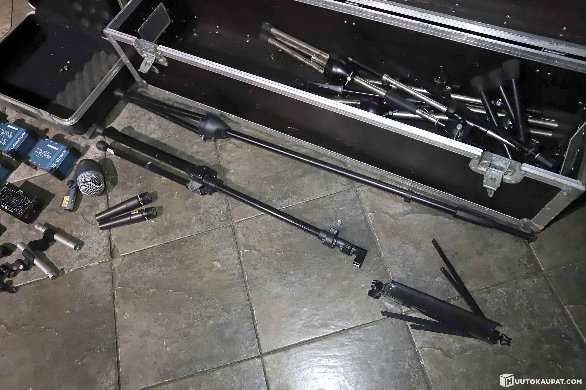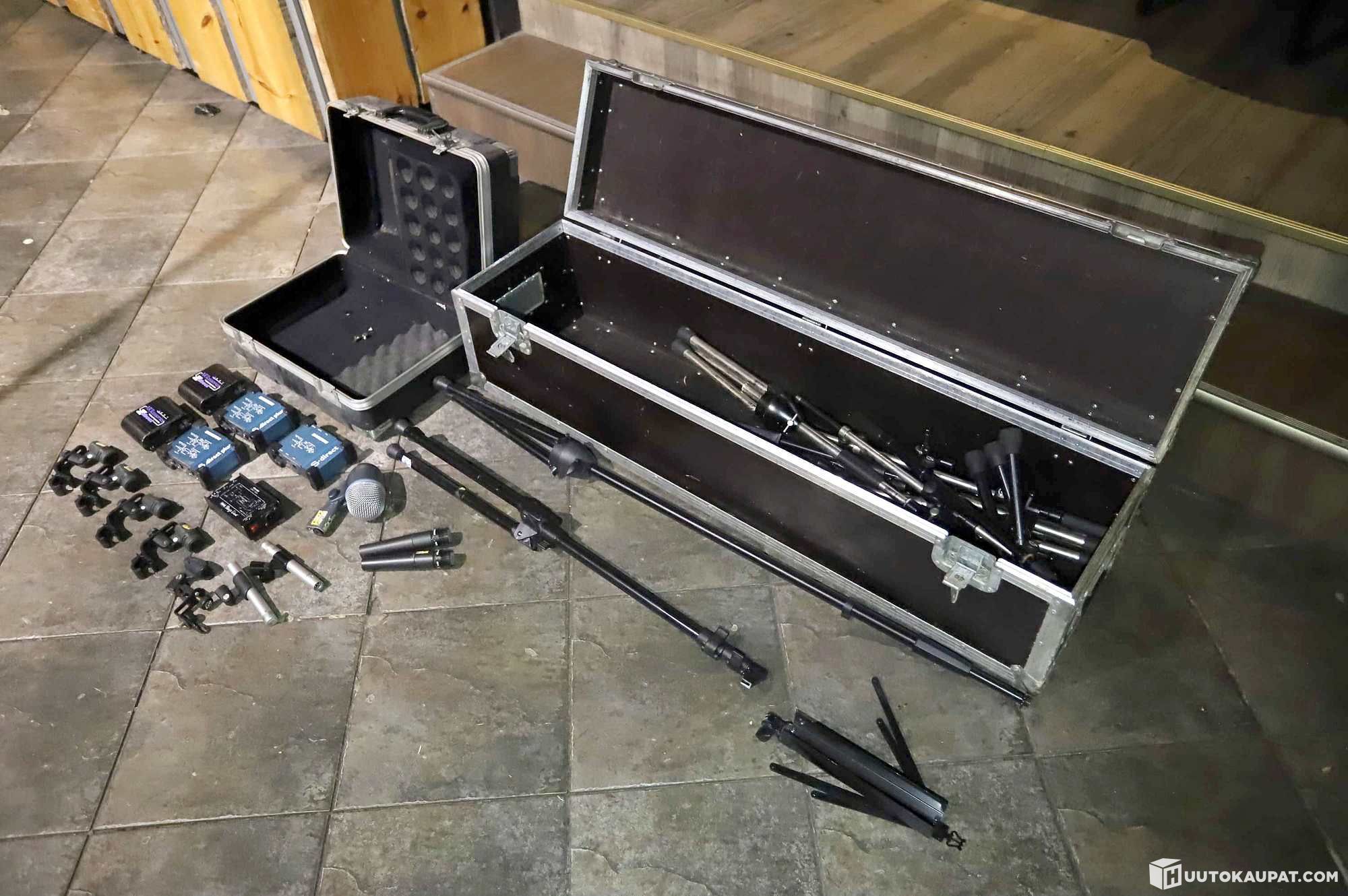 DI-bokseja, mikkejä, yms ja kaksi kuljetuslaatikkoa.