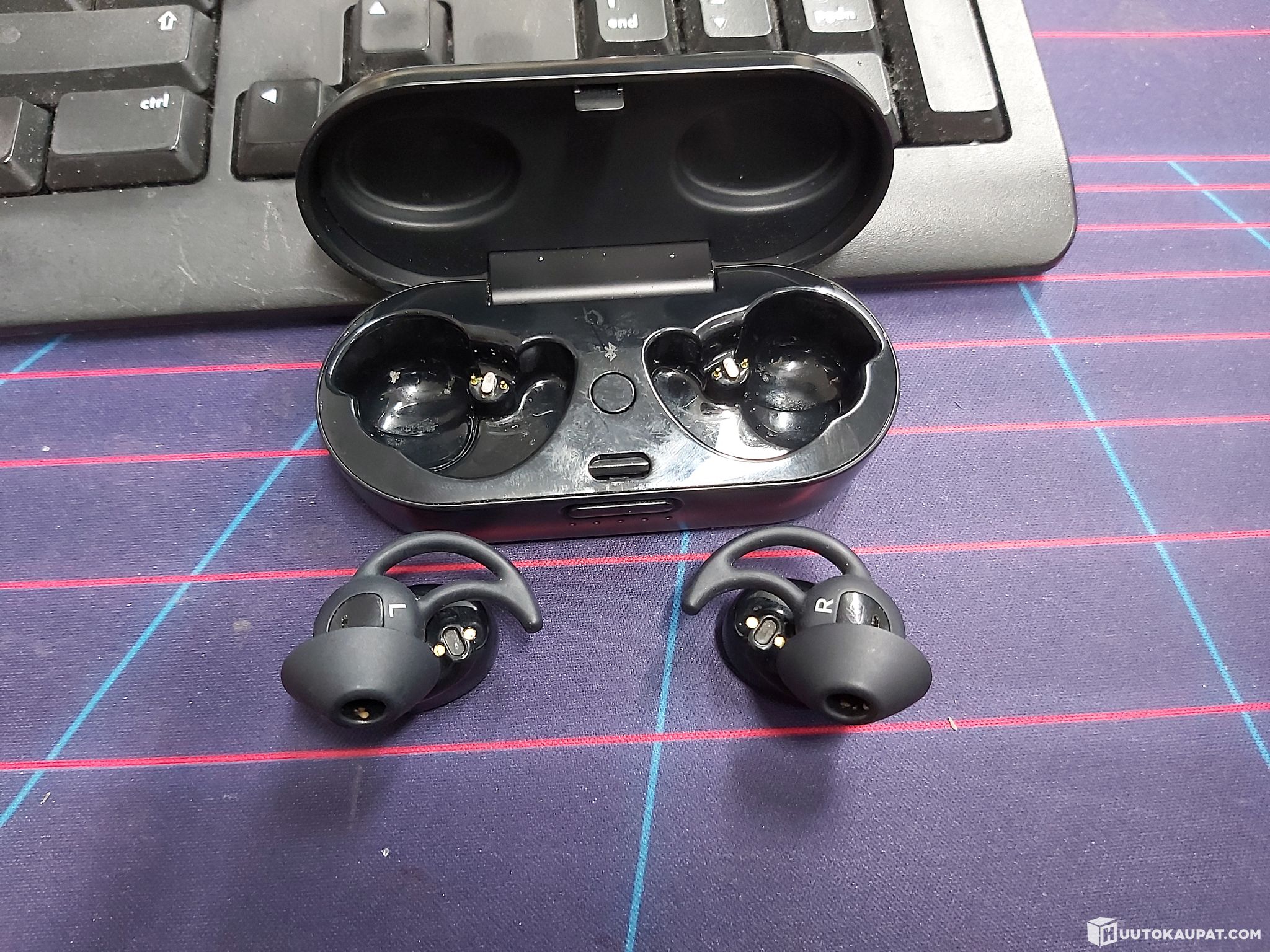 Käytetyt. Mukana napit, latauskotelo ja laturi.