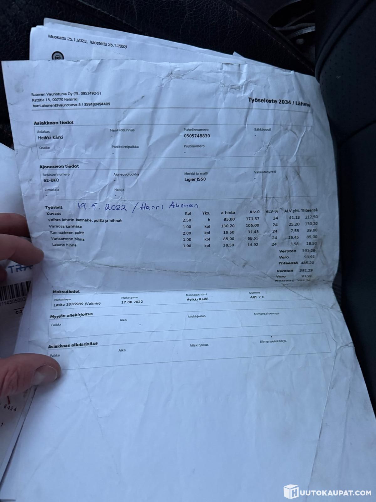 01-2022 Iso huolto + pakoputkiston osia, tuulilasi, viiksipaketti, akku uusittu