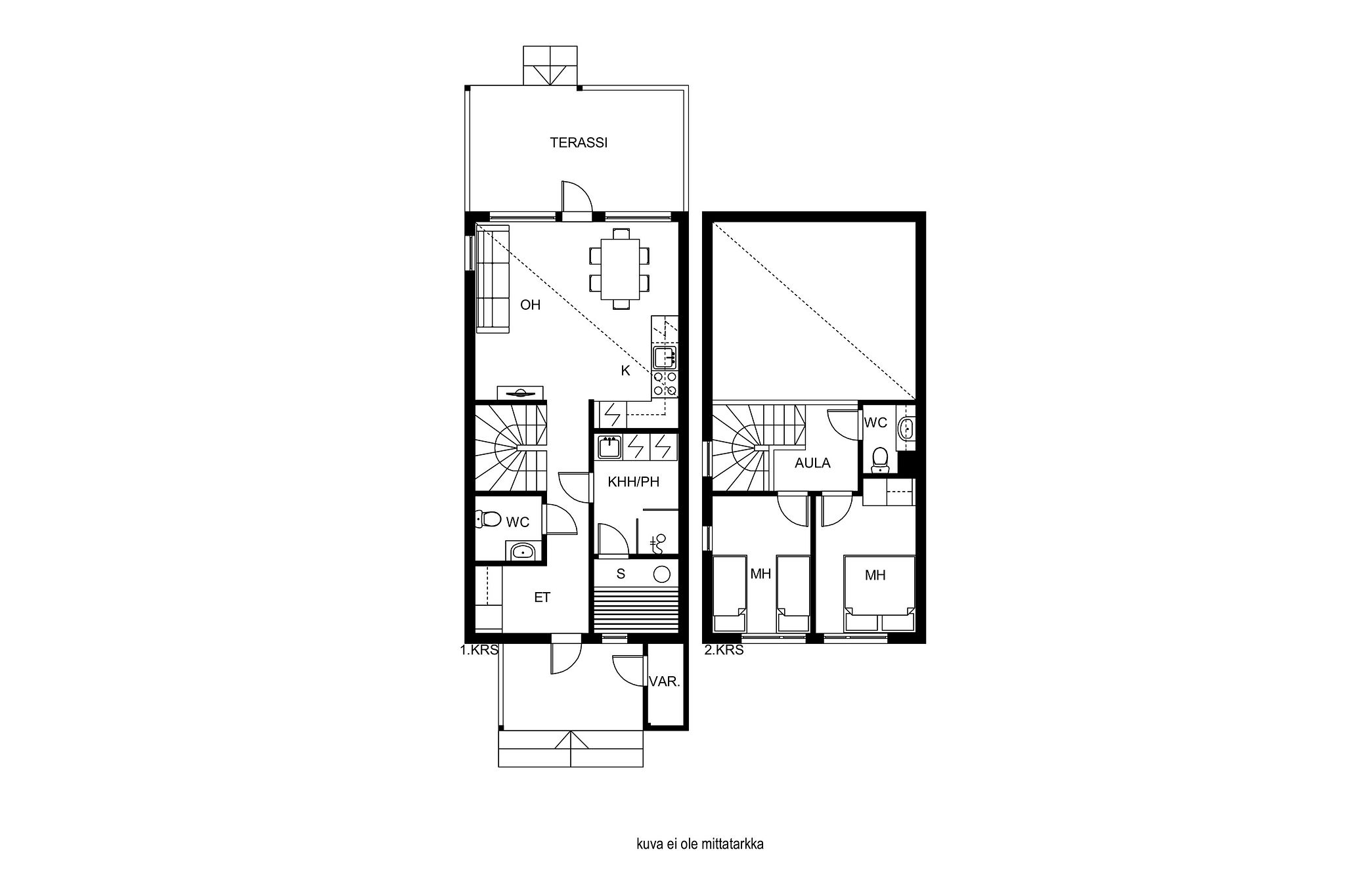 • Toimiva pohjaratkaisu ja laadukkaat materiaalit: tilava kylpyhuone ja sauna sekä kaksi erillistä wc:tä tuovat luksusta ja käytännöllisyyttä.