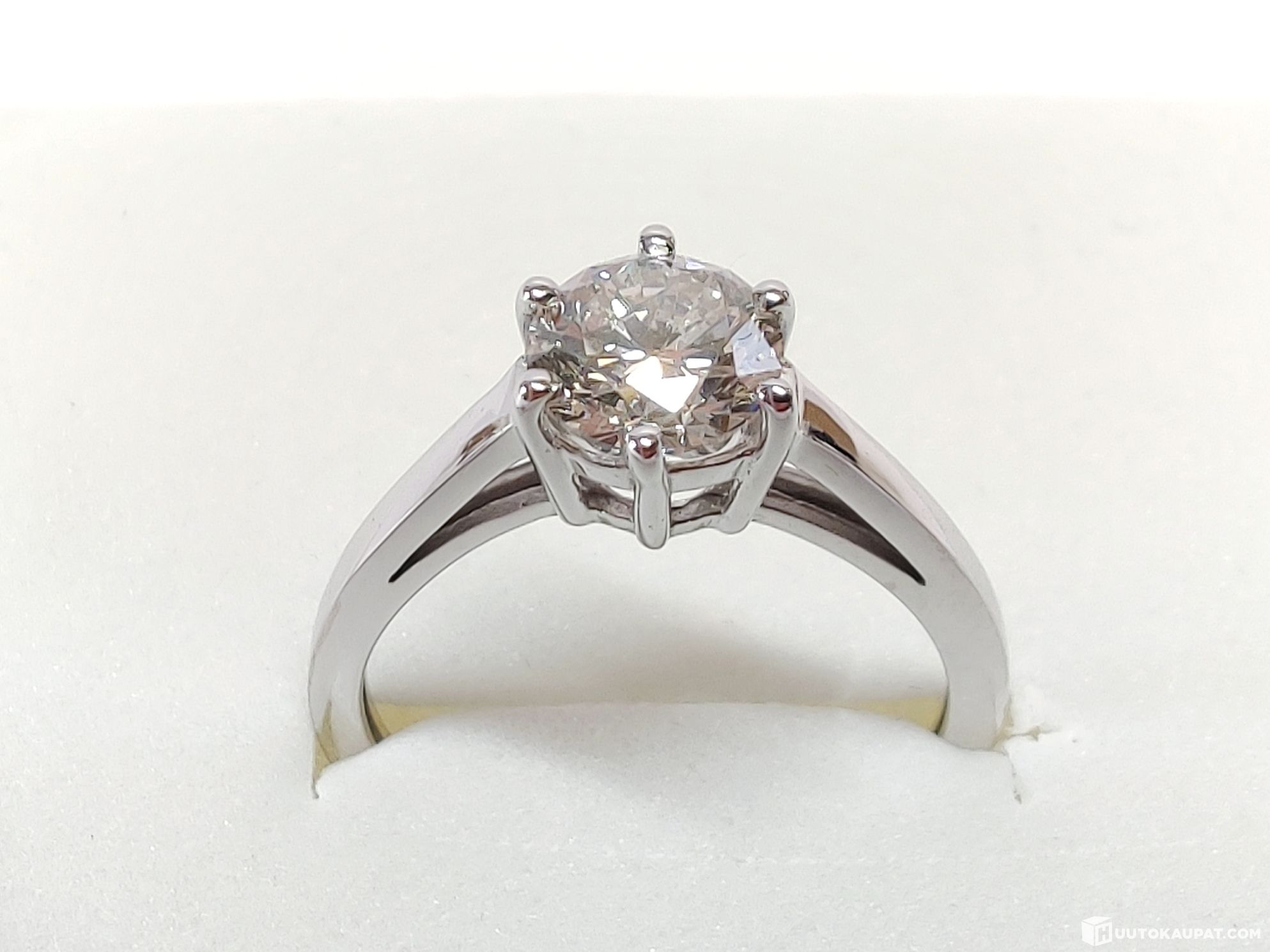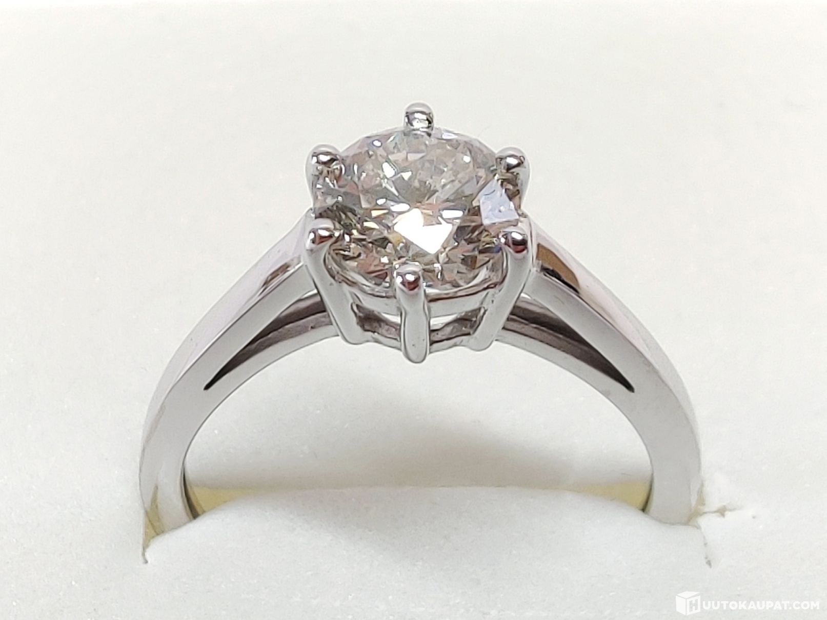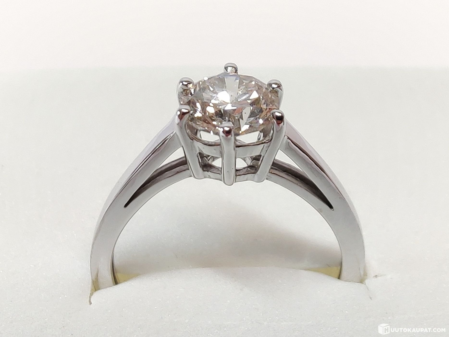 Klassisen kaunis 1,04 karaatin briljanttihiottu VS2 Top Wesselton -timanttisormus 585 14k kultaa. Puhdas ja erinomaisen laadukkaasti hiottu luonnontimantti. Jalokivitodistus.