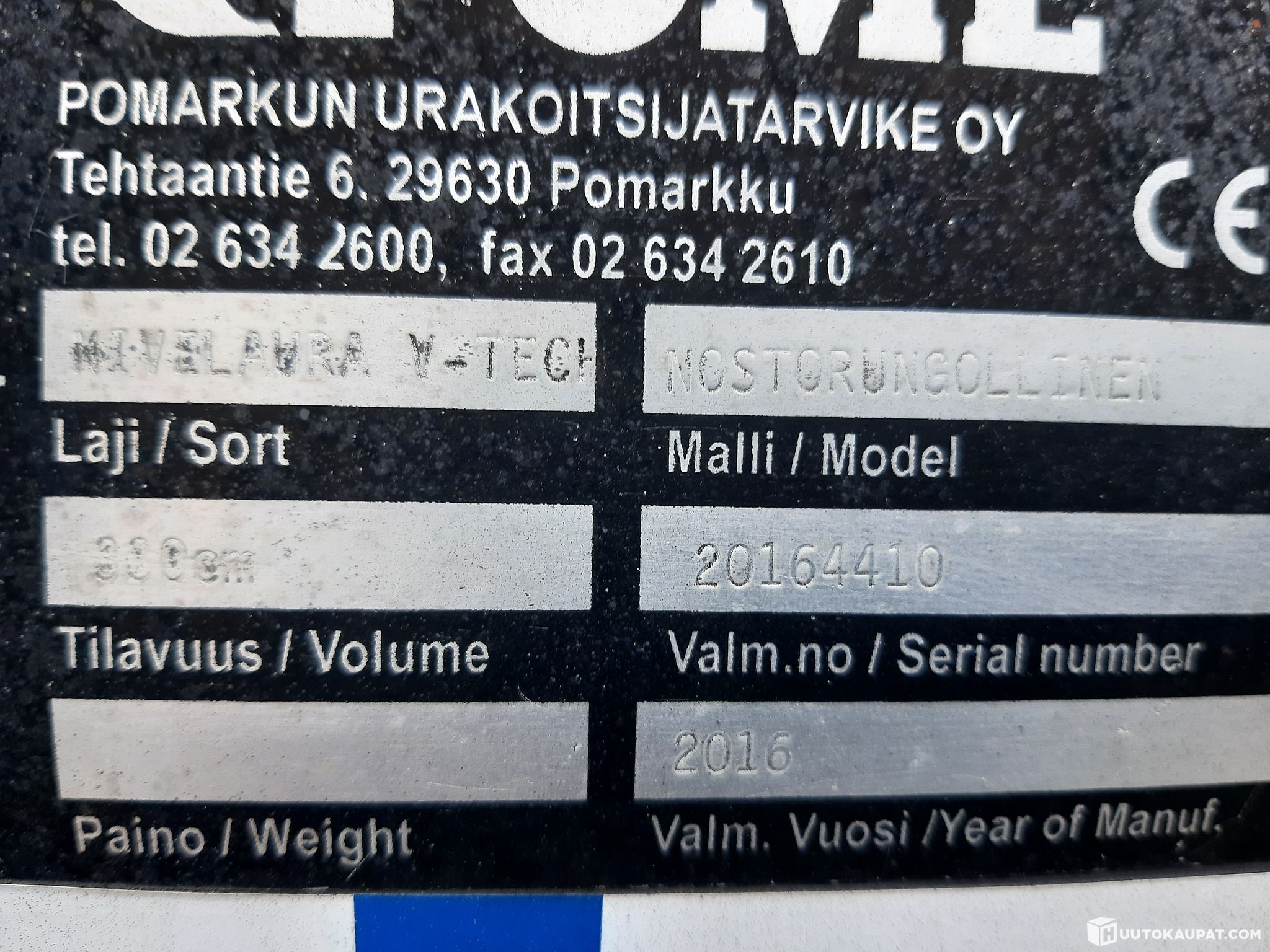 Käytöstä poistettu kuorma-auton nivelaura POME V-Tech 330, valmistenumero 20164410. "Tielaitos" kiinnike.