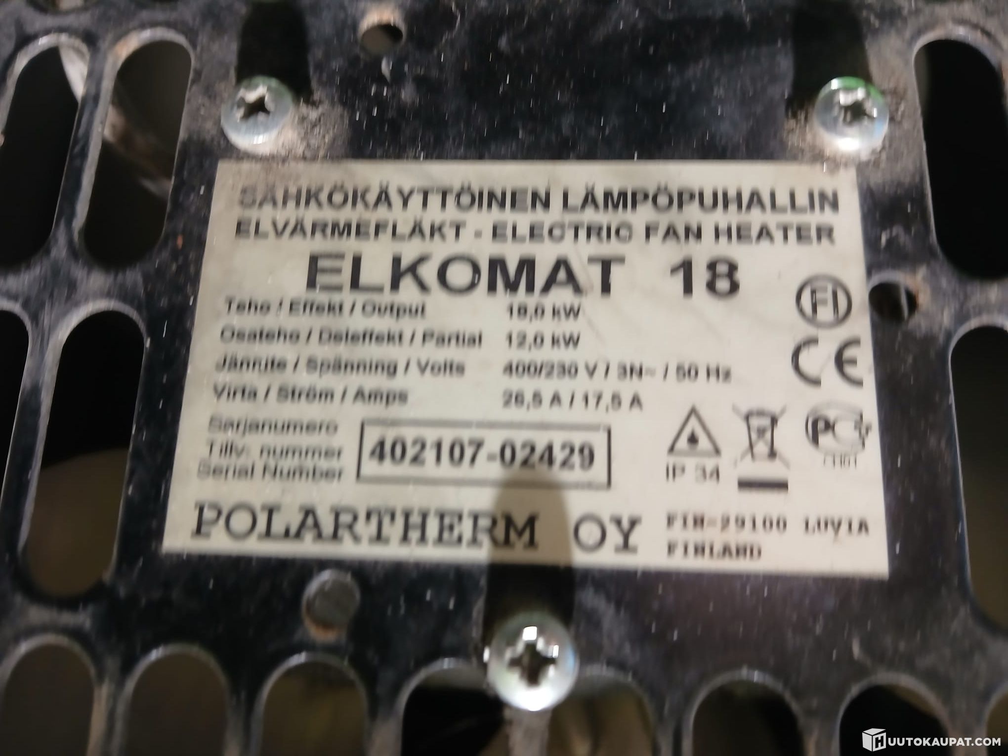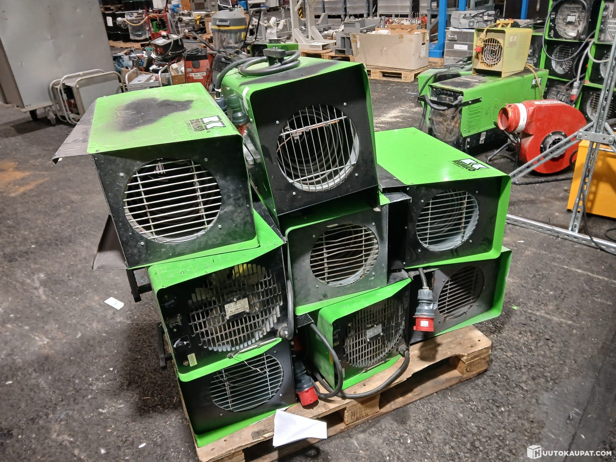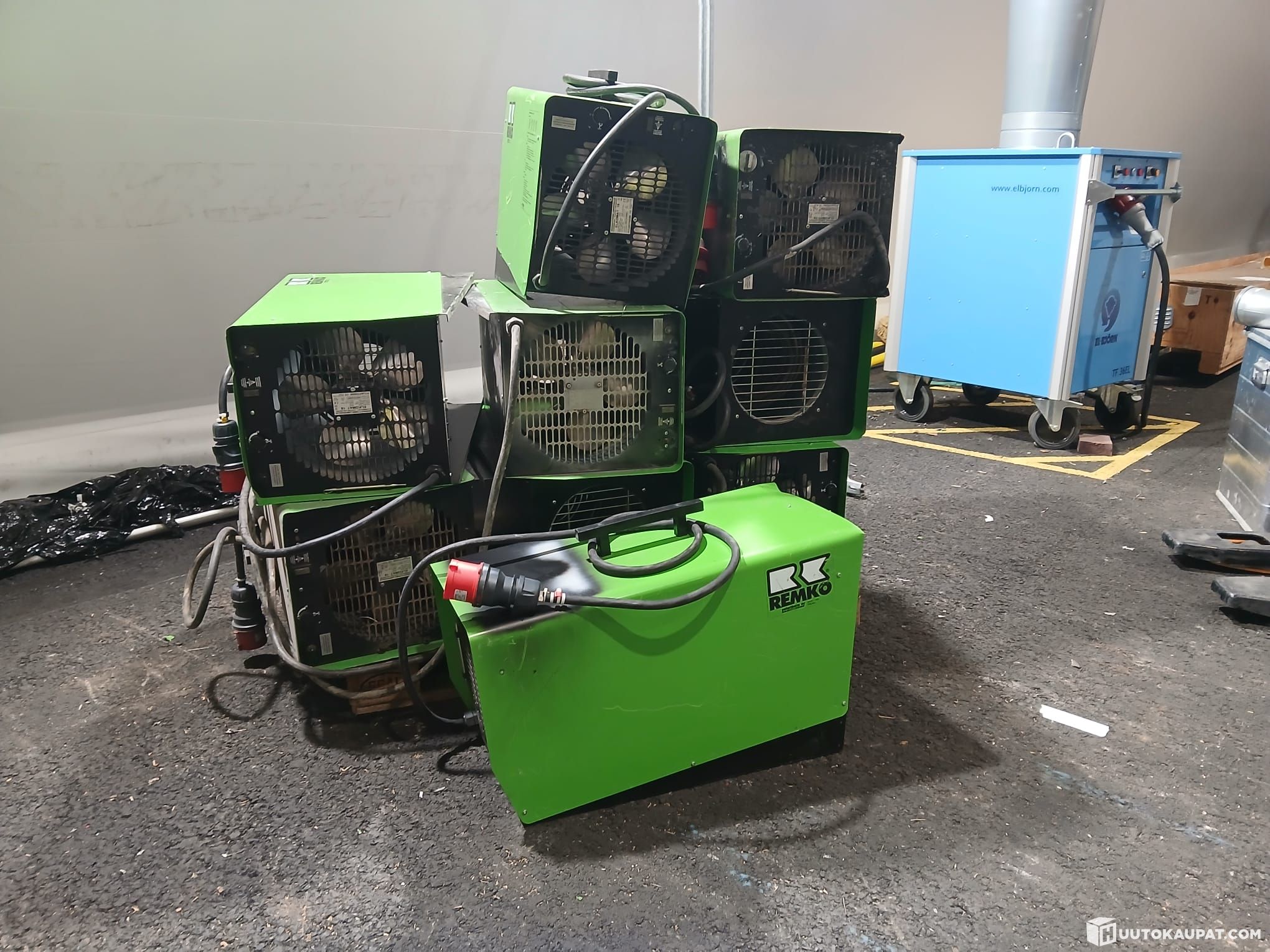 Sähkökäyttöisiä lämpopuhaltimia Elkomat 18, valmistettu Suomessa.