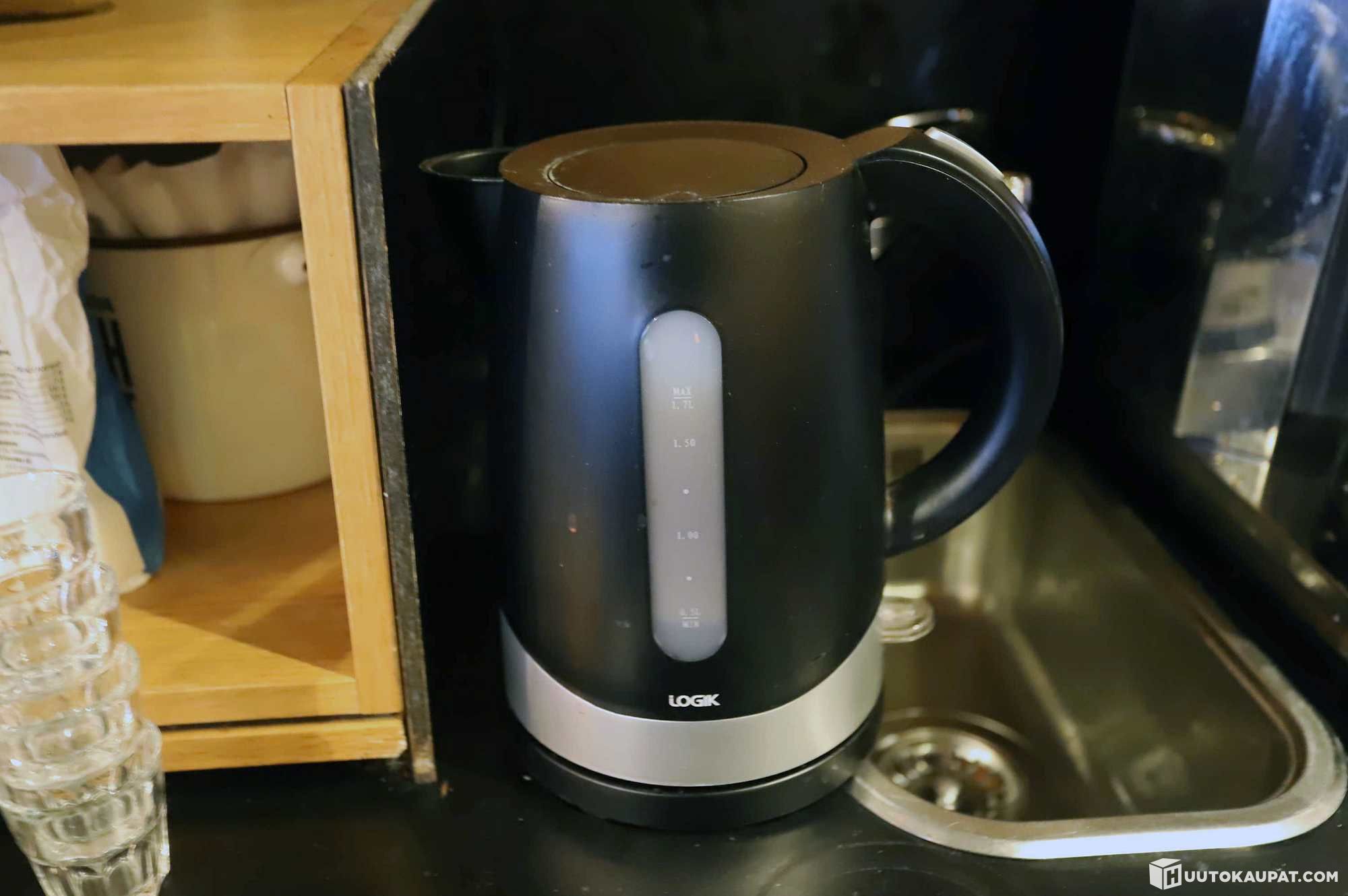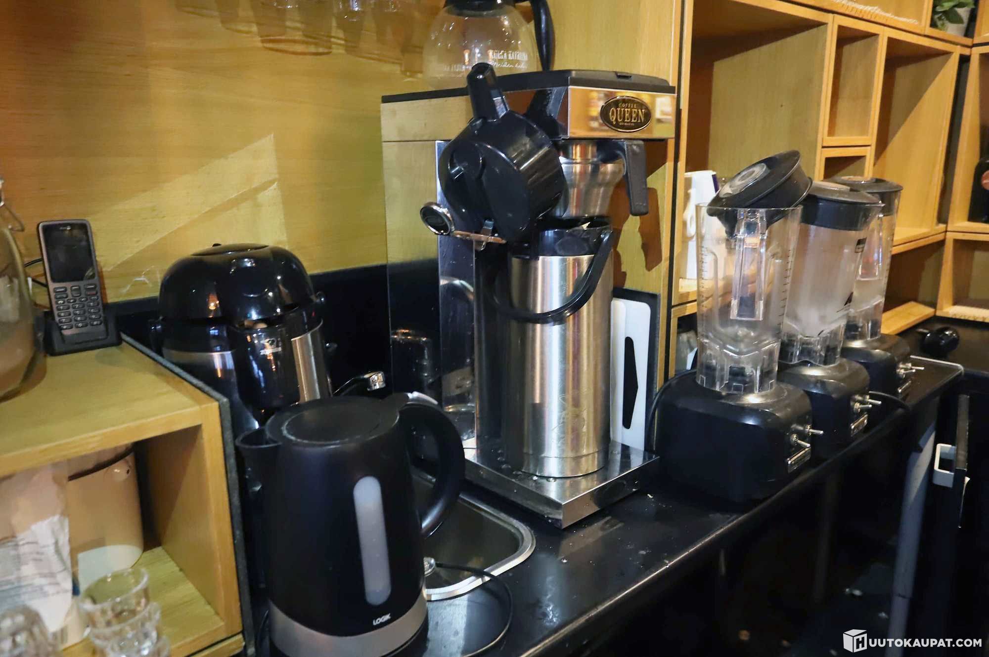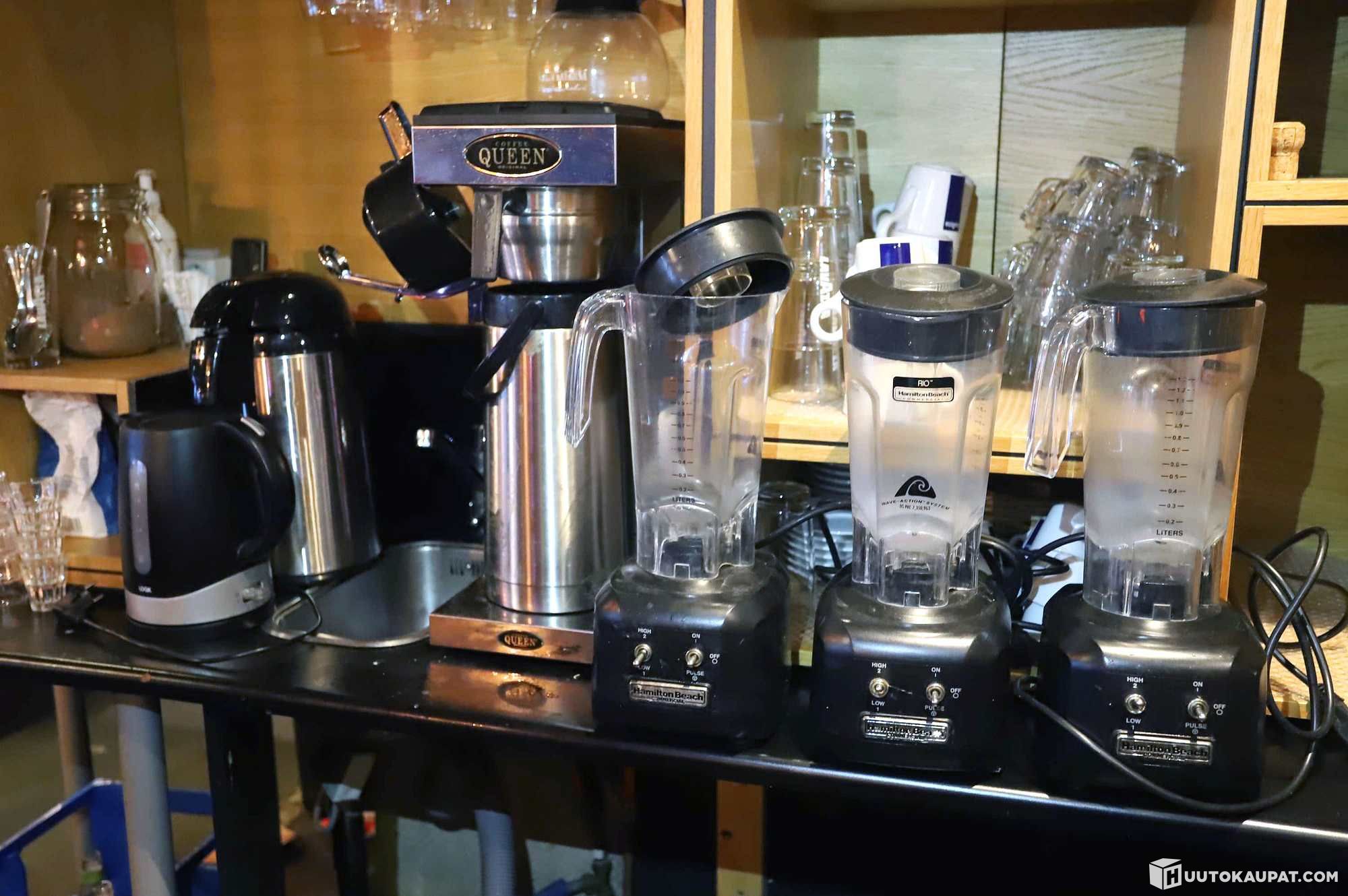 Hamilton Beach-blendereitä 3 kpl, Coffee Queen-kahvinkeitin, pumpputermareita 2 kpl, kahvipannu ja vedenkeitin.
