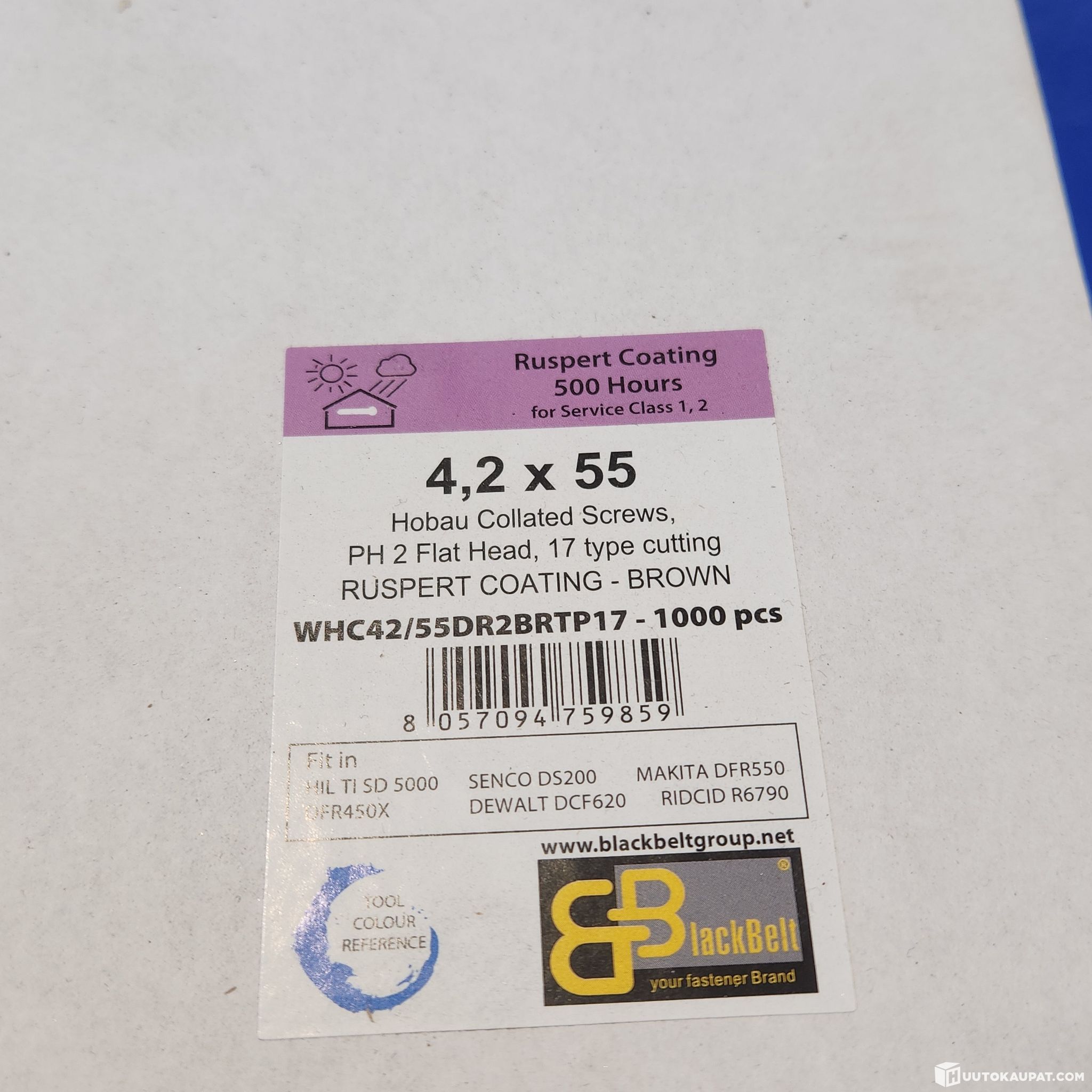 Laadukkaita Black Belt merkkisiä Ruspert nauhaterassiruuvia tasapäisiä 4,2 x 55 mm väri ruskea. 5kpl laatikoita 1000 kpl x 5 laatikkoa. Meillä on laaja valikoima kiinniketarvikkeita sekä koneita ja laitteita rakentamiseen.