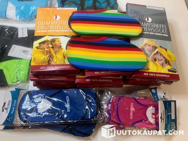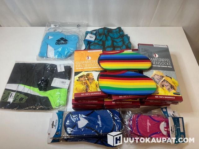 Huippuerä uusia värikkäitä kumisaapastossuja, uima-/allassukkia ja Arena-uima-asuja. Kaikki käyttämättömiä, alkuperäispakkauksissaan – erinomainen erä esim. perheelle, päiväkotiin, kerhoon tai jälleenmyyntiin.