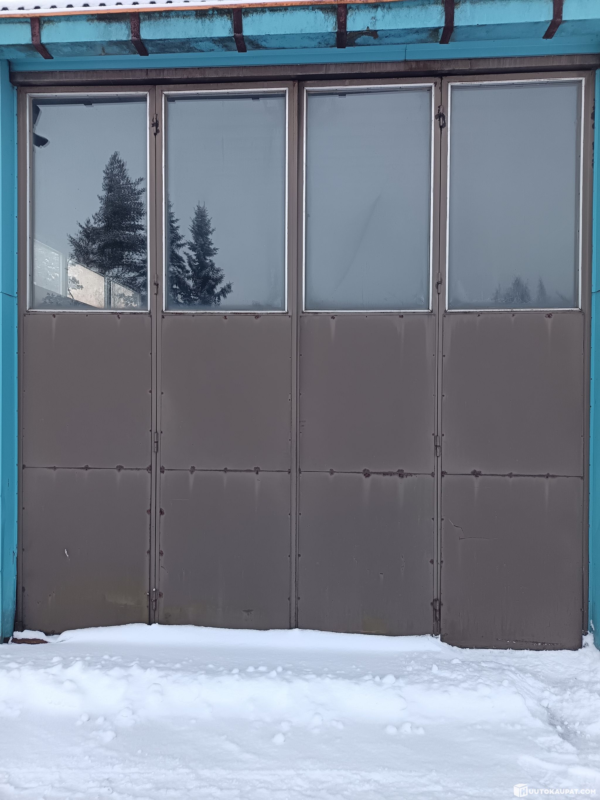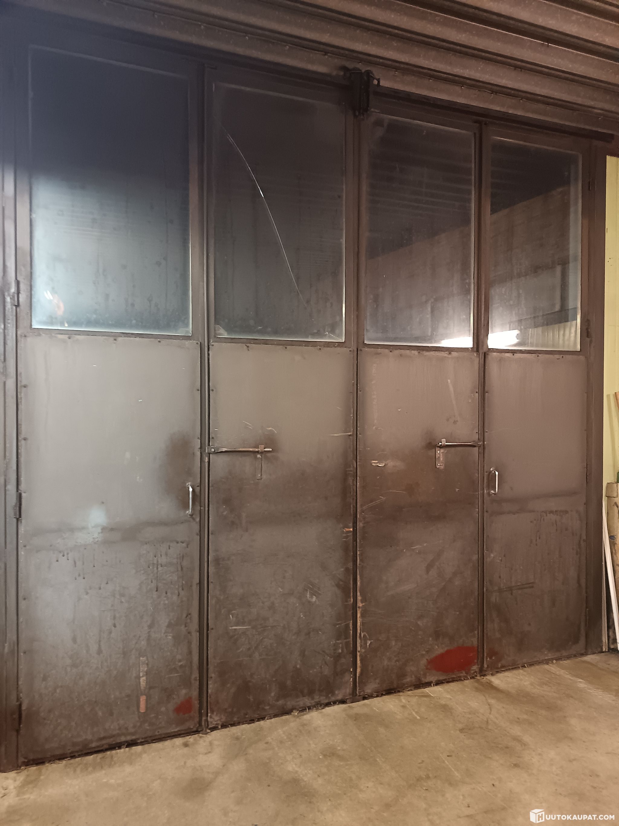 Hallin 4-lehtiset taiteovet 2 +2 lehteä, mitat 3600*3600mm .rautarunko ,lämpöeristeet ,lasi-ikkunat ,käsikäyttöiset ,lukkosalvat .Ei karmia