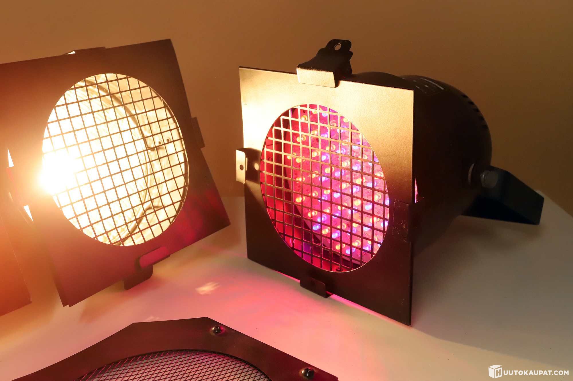 Kolme tölkkiä ja yksi LED PAR