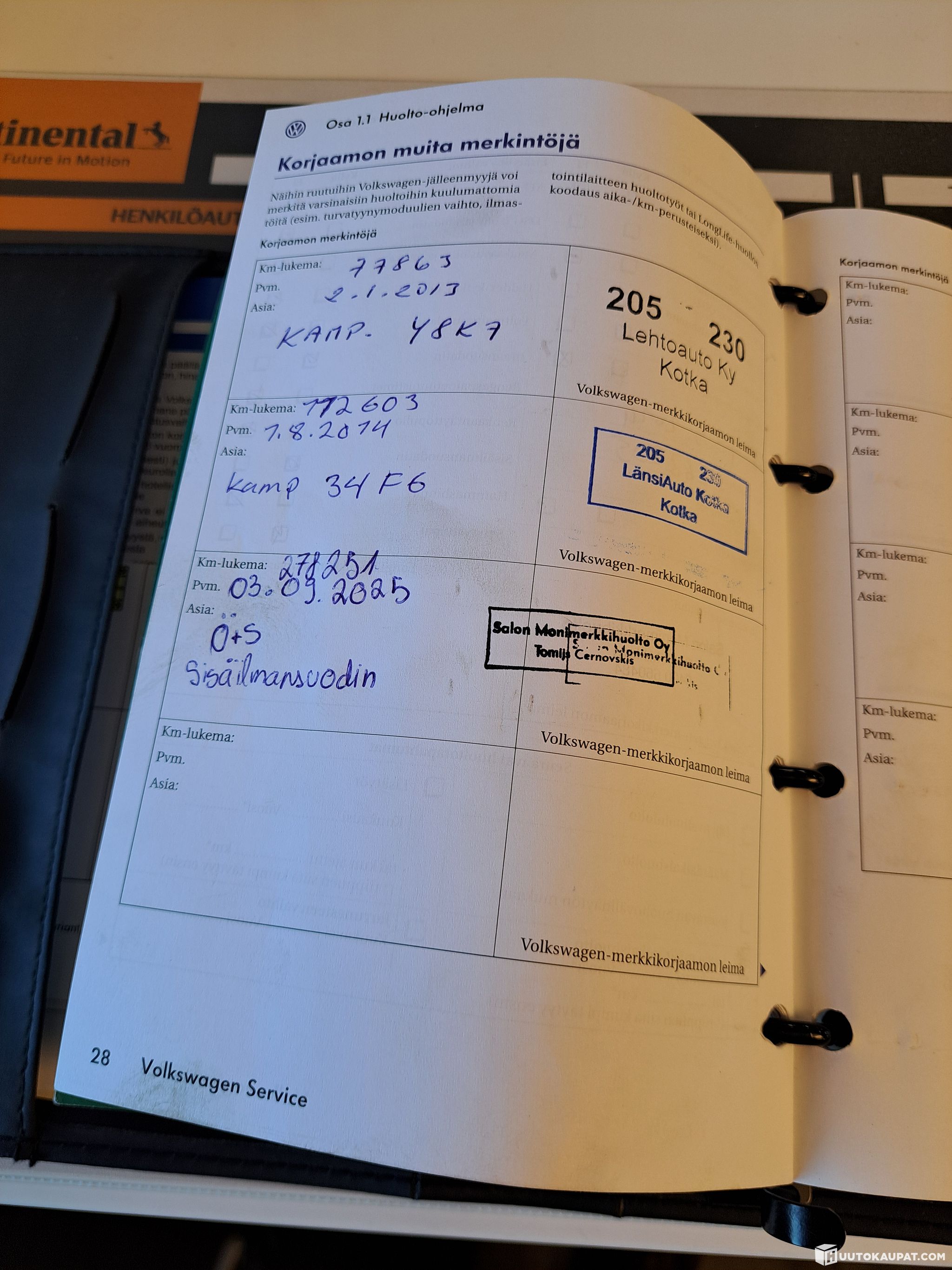 Viimeisin huolto tehty 278 tkm/-25
