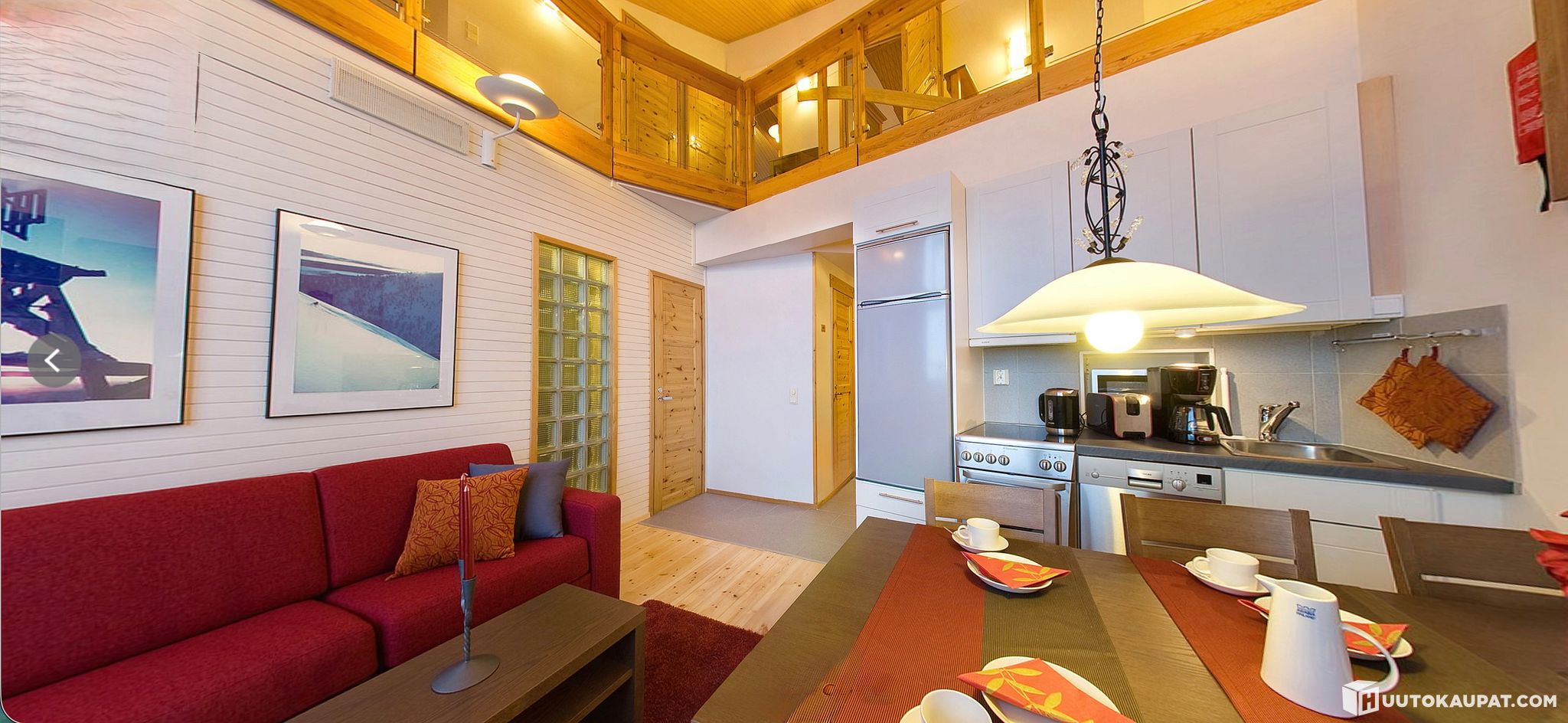 Kaksikerroksinen lomahuoneisto, jossa kolme makuuhuonetta, olohuone, keittiö, kaksi kylpyhuonetta ja wc:tä sekä sauna