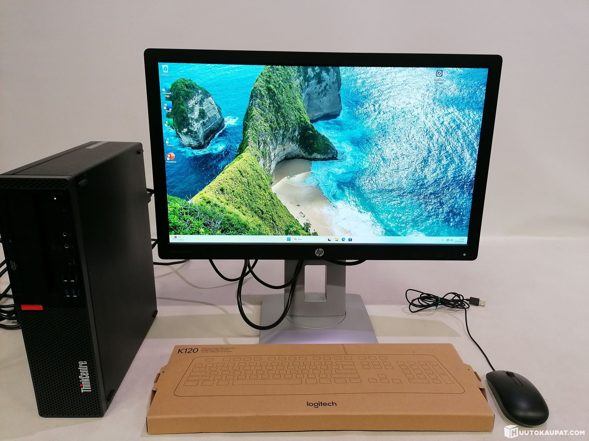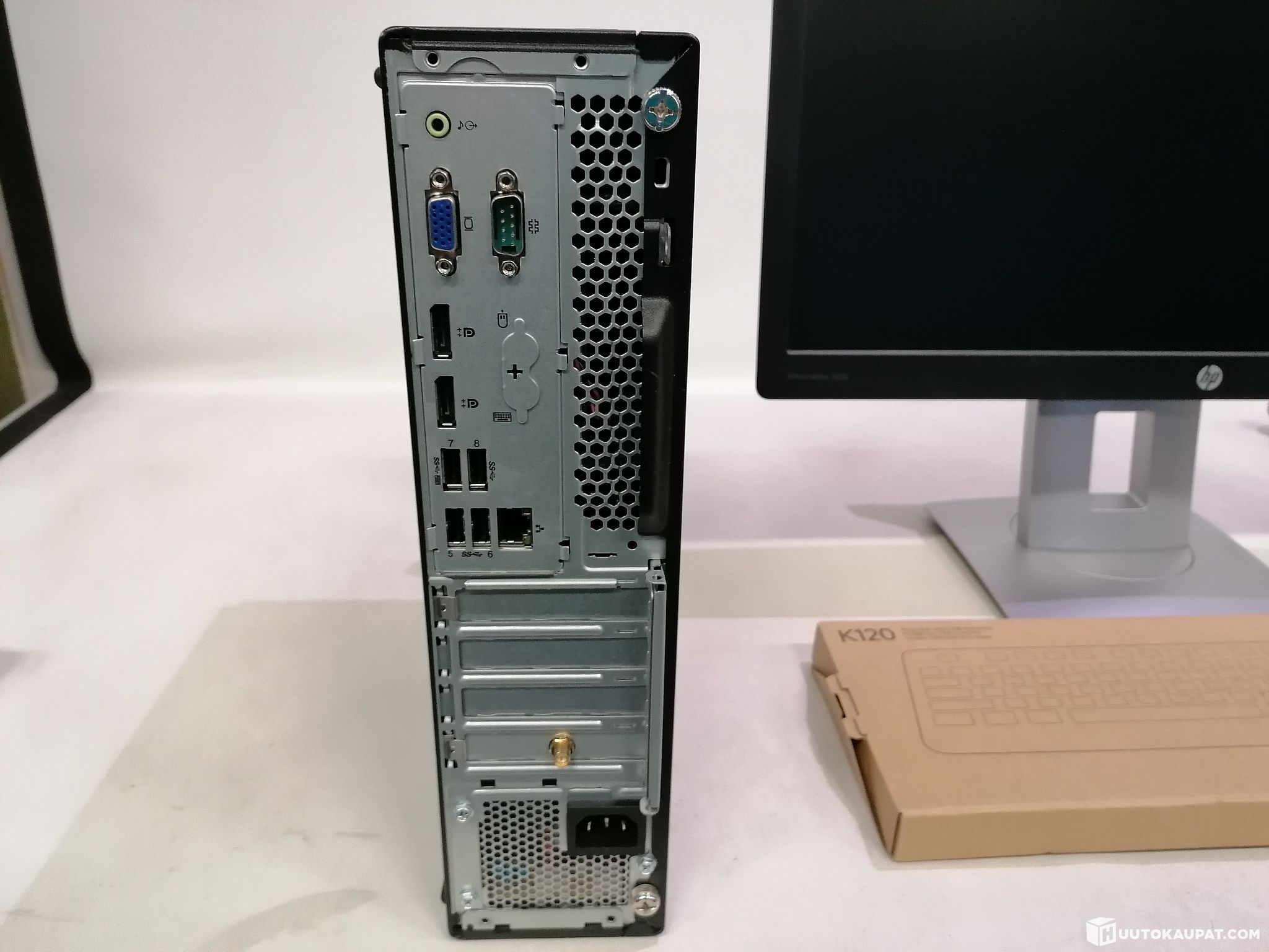 Mukana tulee HP yritysnäyttö, näppäimistö, hiiri, virtajohdot, Displayport kaapeli ja Ethernetkaapeli.
