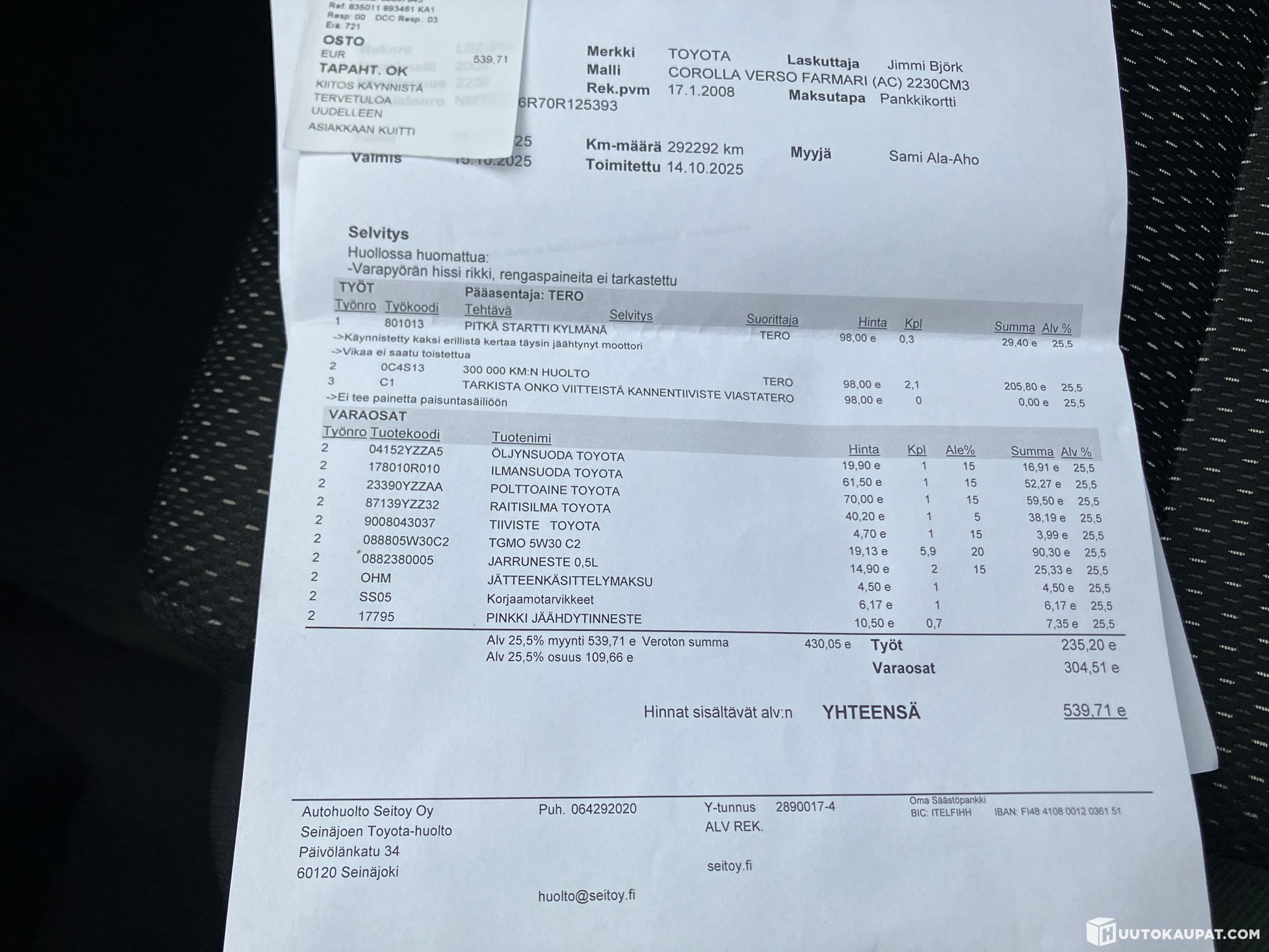 Auto ollut ainoastaan kahdella yksityisellä omistajalla koko historian aikana, ensin 2008-2017 ja sitten 2017-tähän päivään toisella. Koeajolla kaikki toimi niinkuin pitääkin, ei kilise, kolise, täristä tai muutakaan. Kuski ajoi Seinäjoelta Hyvinkäälle ilman huomioita, myös Hyvinkään päässä testattu meidän toimesta toimivaksi! Huollettu säännöllisesti, viimeisin 15.10.2025 / 292tkm. Näille autoille tyypillinen kansiremontti tehty myös 12.2018 / 187tkm. Ja tosiaan 19.11.2025 katsastettu ilman korjauskehotuksia.
