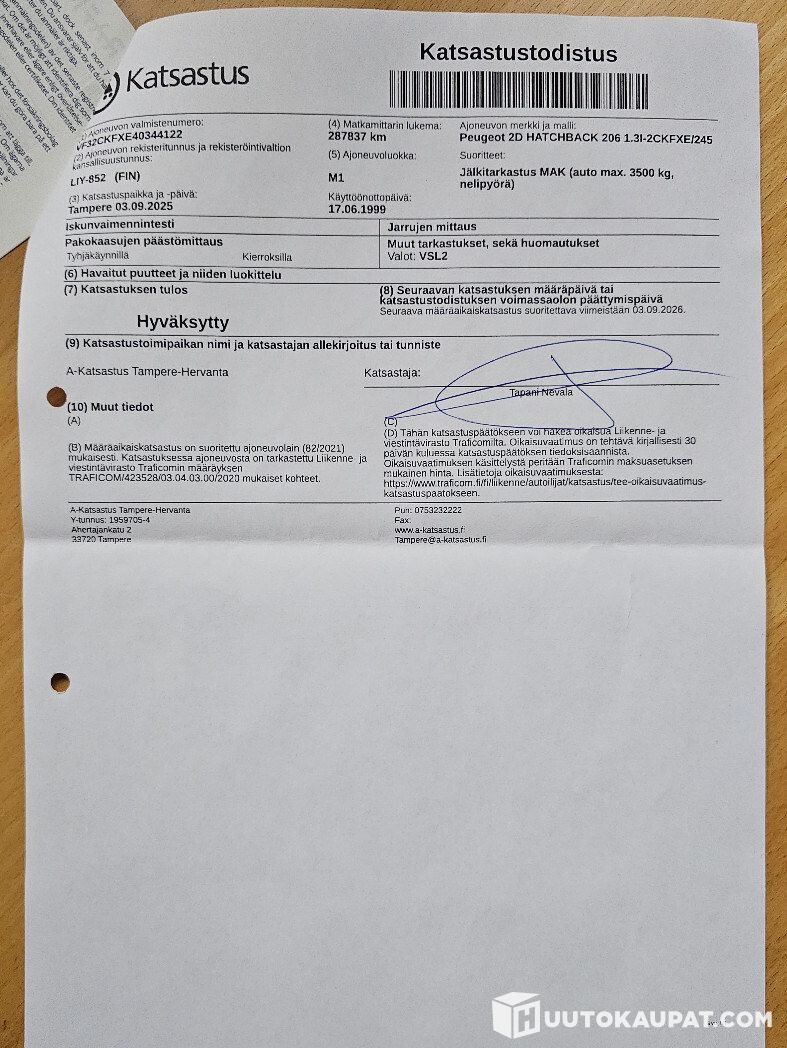 • 9/2025 287838 km: Uusintakatsastus, pohjan pitkittäiskoteloiden ruostevauriot korjattu. Renkaat tarkastettu, runkovikoja ei havaittu. Oikean vetoakselin sisäpää naksuu.