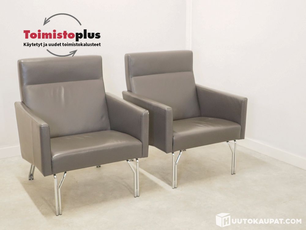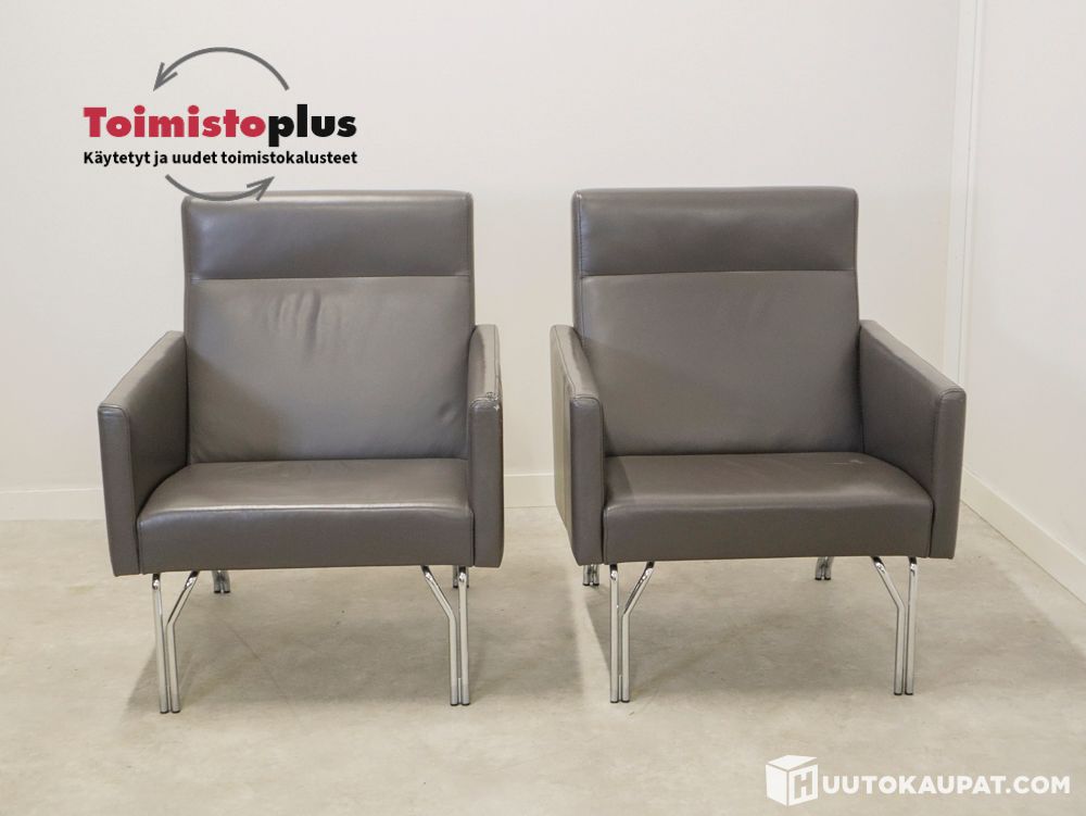 Harmaat nahkaiset, ehjät ja siistit verhoiluosat.