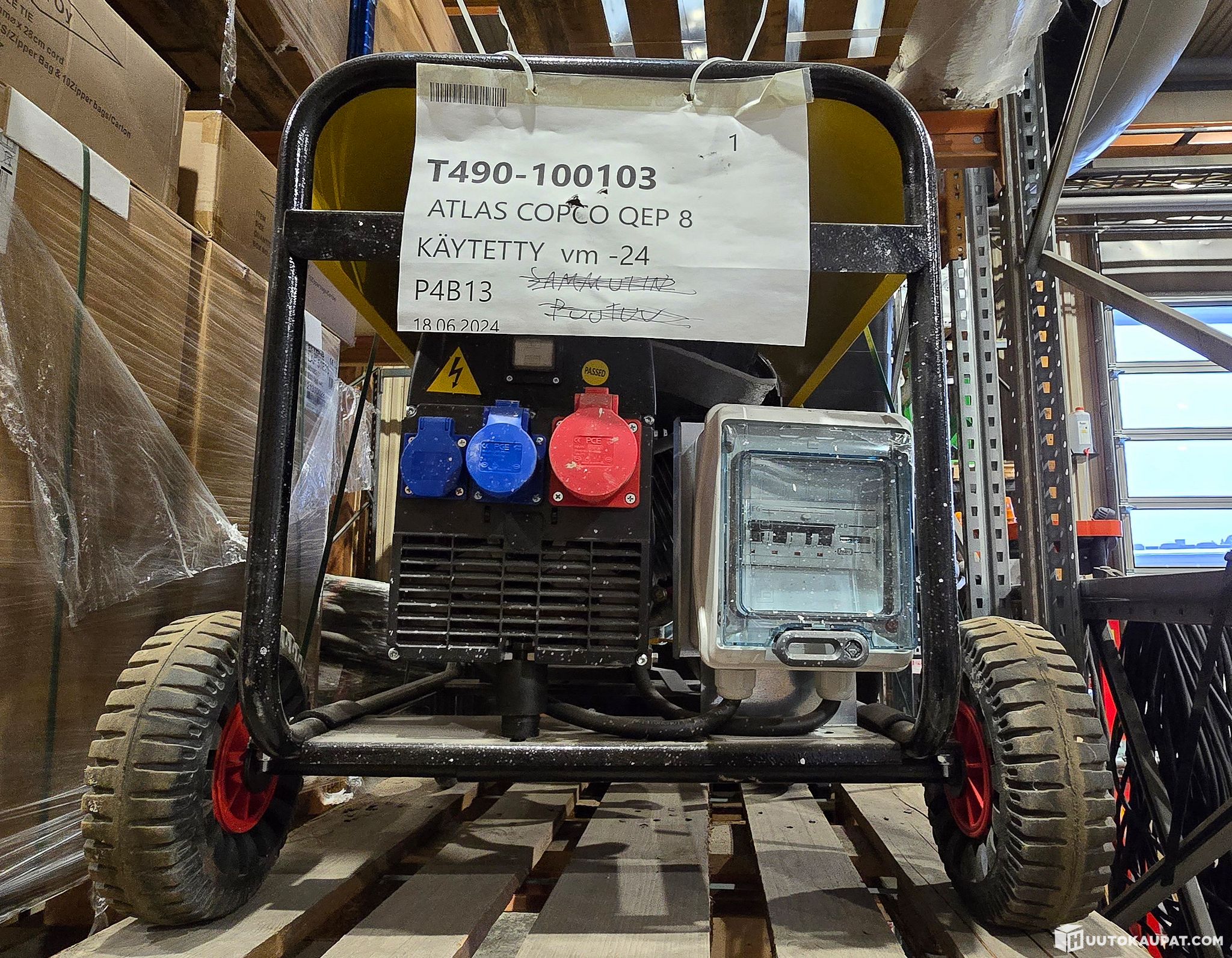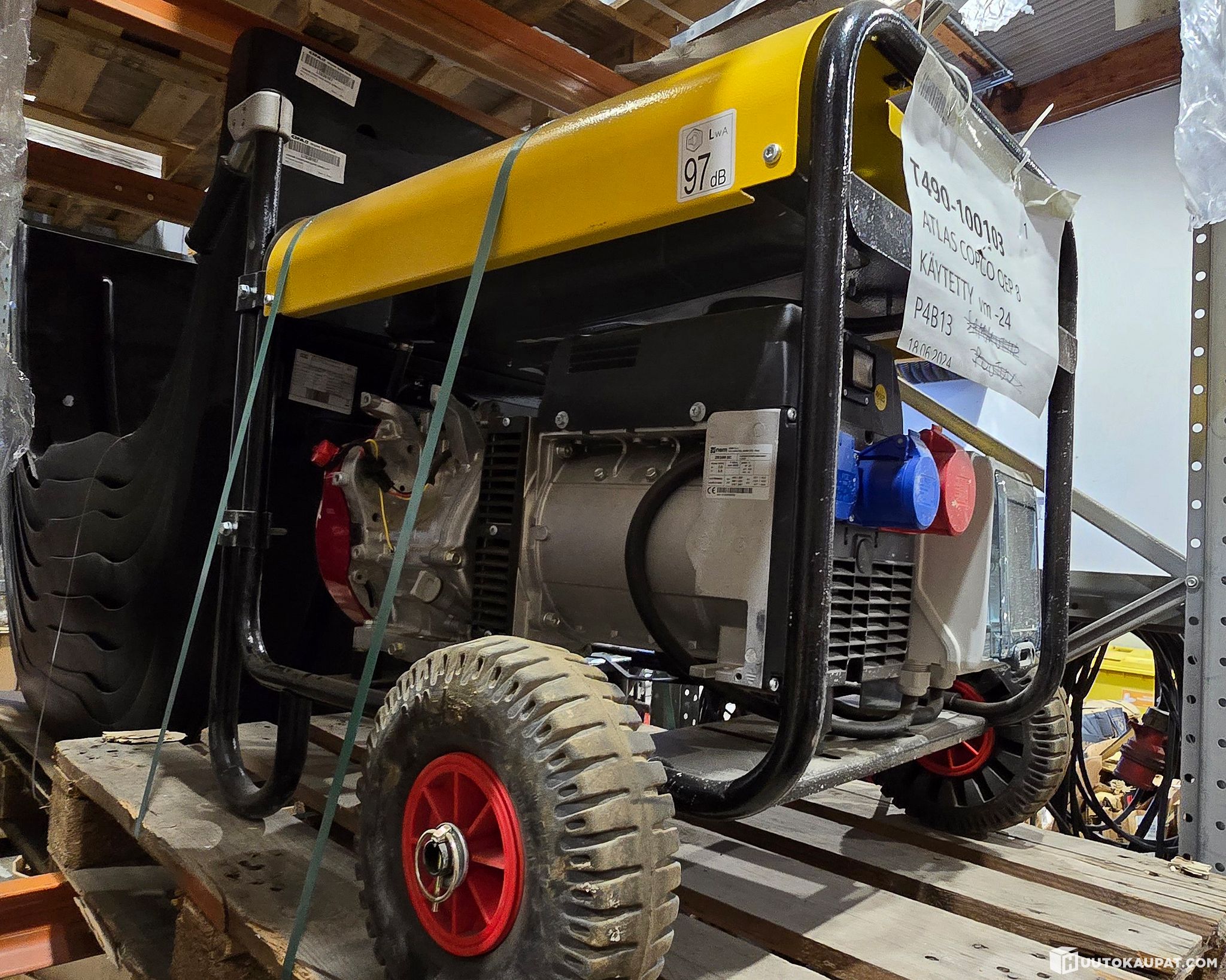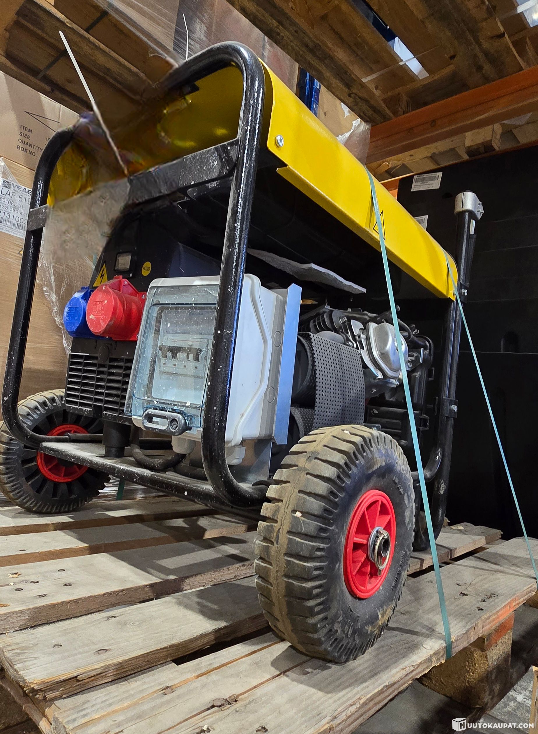 Erittäin vähän käytetty, (viikko) Aggregaatti kahvoilla ja pyöräsarjalla. Ehjä ja huollettu genu. Pistorasiat 1 schuko, 1 3P caravan ja yksi 5P 16A, max 8.3 kVA 6,64kW /400V/230V, koneena Honda GX390
