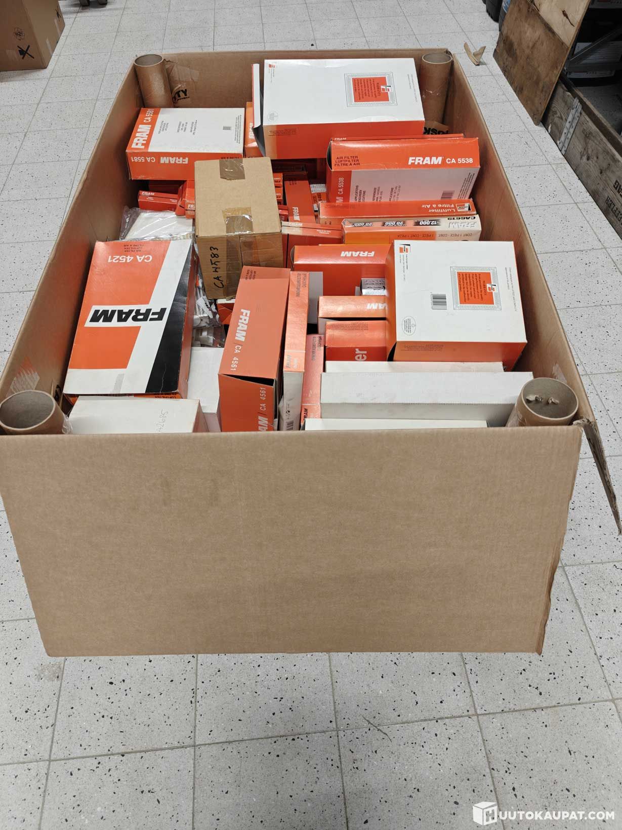 Suuri laatikollinen erilaisia FRAM merkkisiä ilmansuodattimia autoihin. Kohteen kuvissa sekä liitetiedostossa tarkempia numeroita suodattimille sekä osviittaa mille merkille suodatin on tarkoitettu.