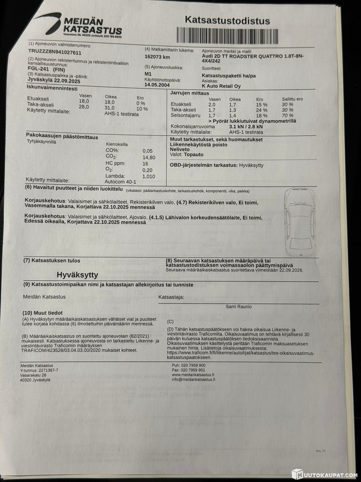 -Korjauskehotuksia ei ole vielä laitettu kuntoon. (ajovalon kork.säätö oikea + rekisterikilvenvalo)