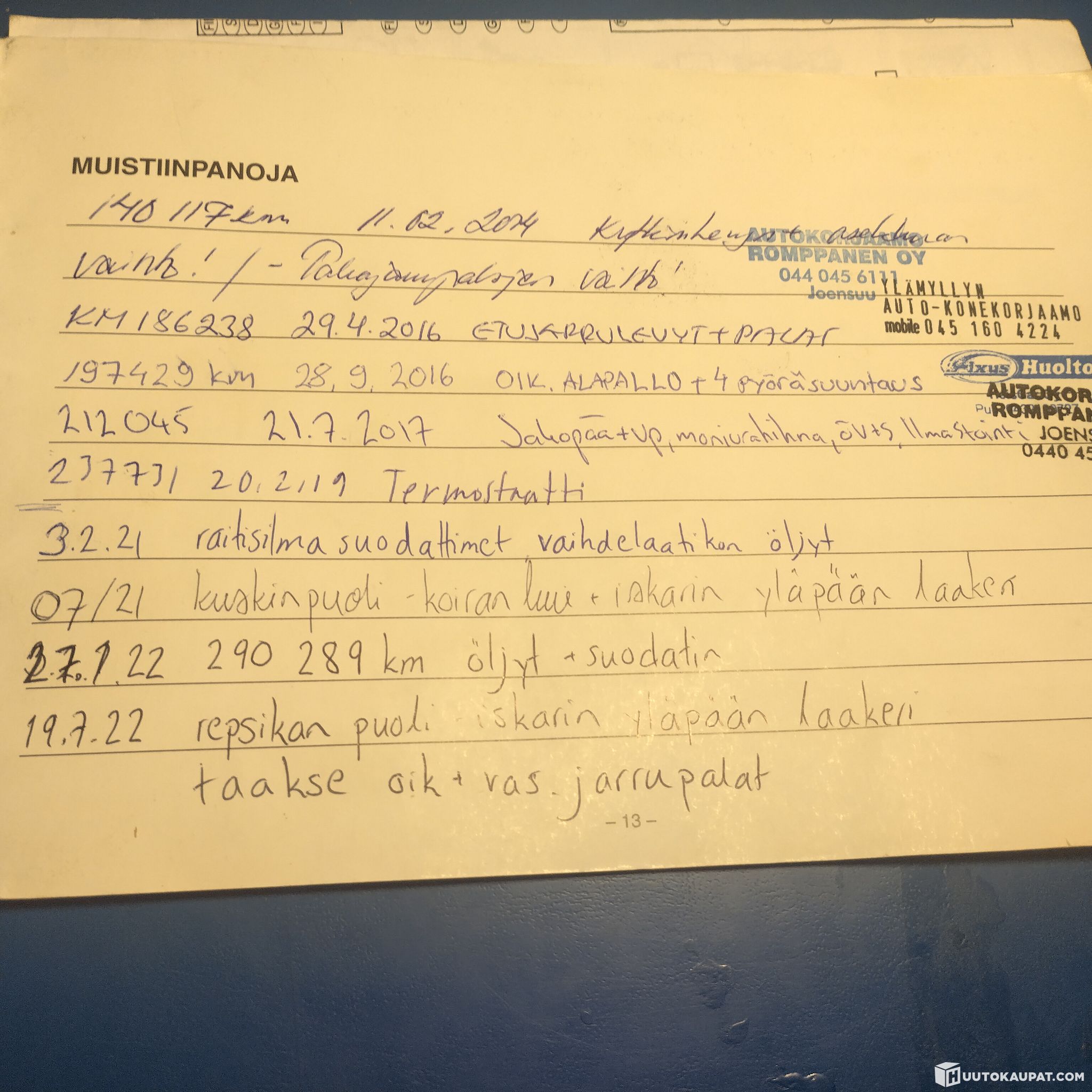 Jakopään huolto: Jakopään hihna, vesipumppu ja moniurahihnat on vaihdettu 20.2.2024.