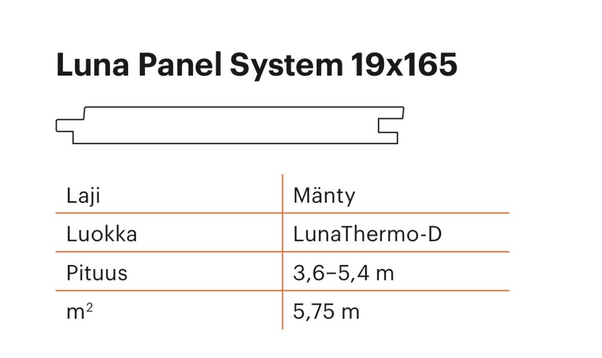 Luna Panel System 19x165 on korkealaatuinen, leveä lämpöpuupaneeli, jonka suora reuna luo 3 mm varjouran paneelien väliin.