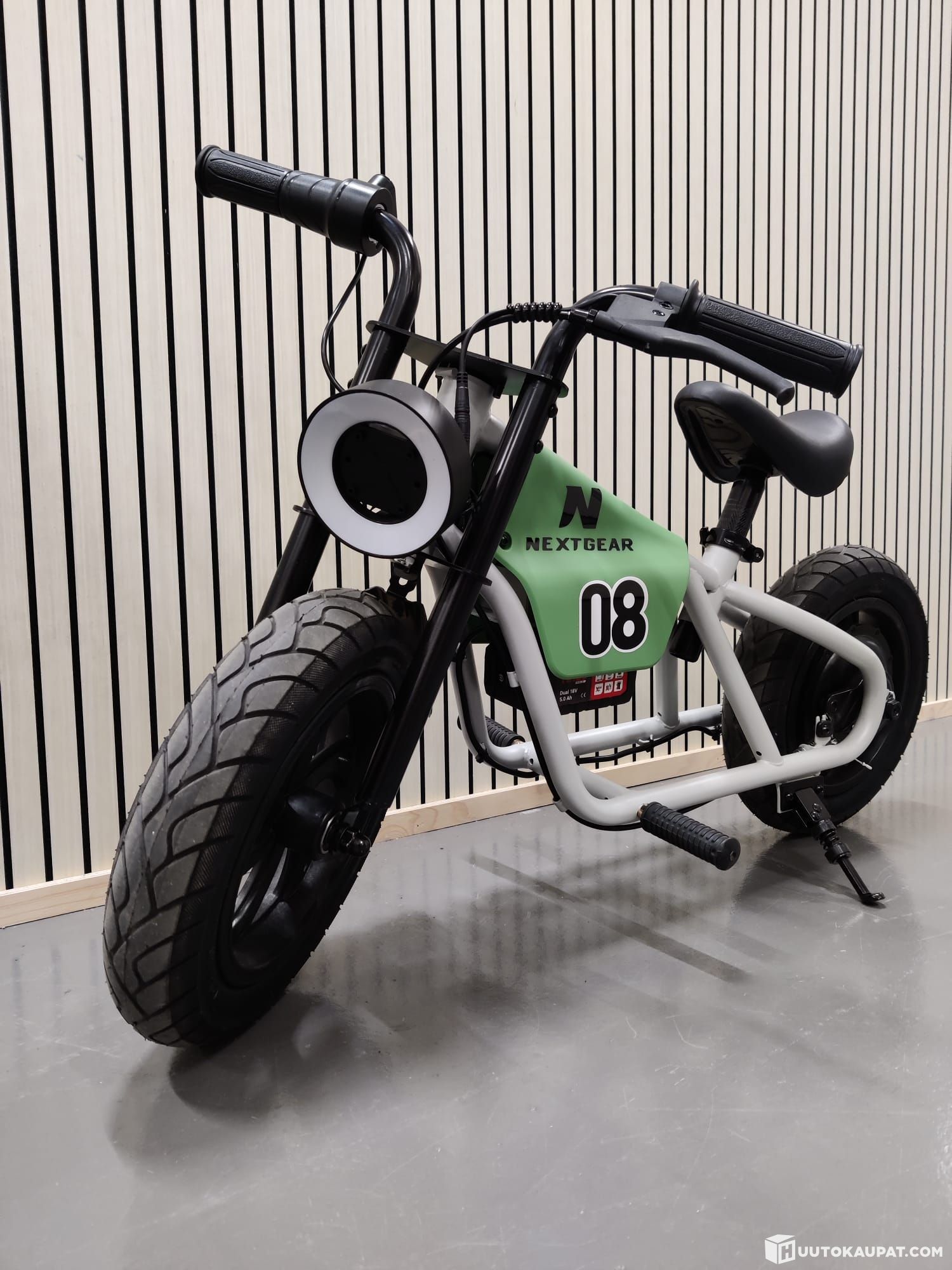 Sähkömopo on varustettu led-ajovalolla ja akkua suojaavalla etulokasuojalla. Hauskuutta ja ajamisen tunnelmaa lisää sisäänrakennettu moottoriääniefekti, joka tarjoaa muhkeat moottoriäänet.