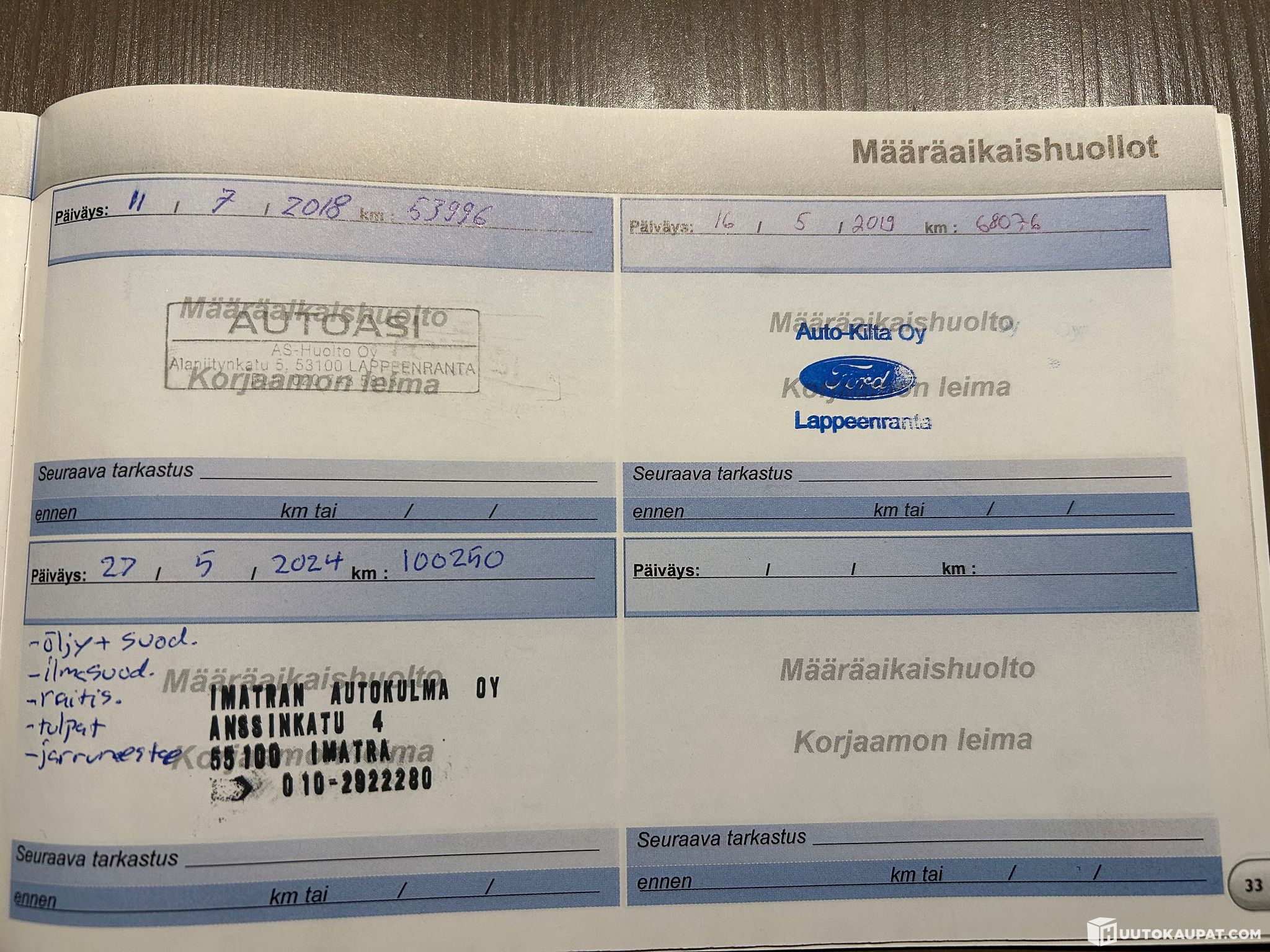 Viimeisin katsastus 9/2025. Kesä- ja talvirenkaat uusittu 2024. Autolle tehty ns. iso huolto kesällä 2024, jossa lisäksi uusittu etujarrut ja apulaitehihna (kuitit kuvissa). Lisäksi moottoriöljyt ja suodatin vaihdettu säännöllisesti, n. 10 tkm välein, käyttäen aina Peugeotin suosittelemia öljyjä.