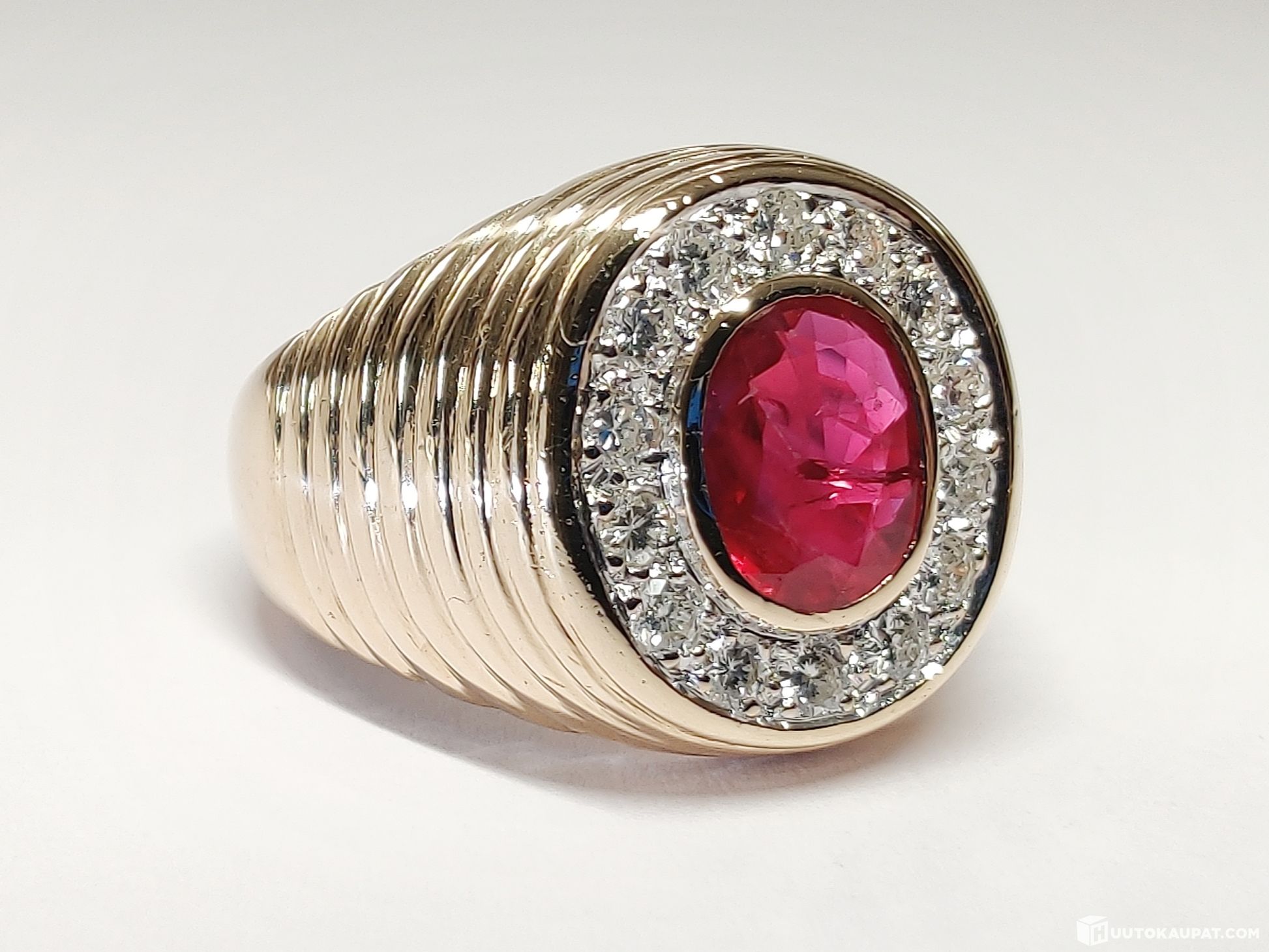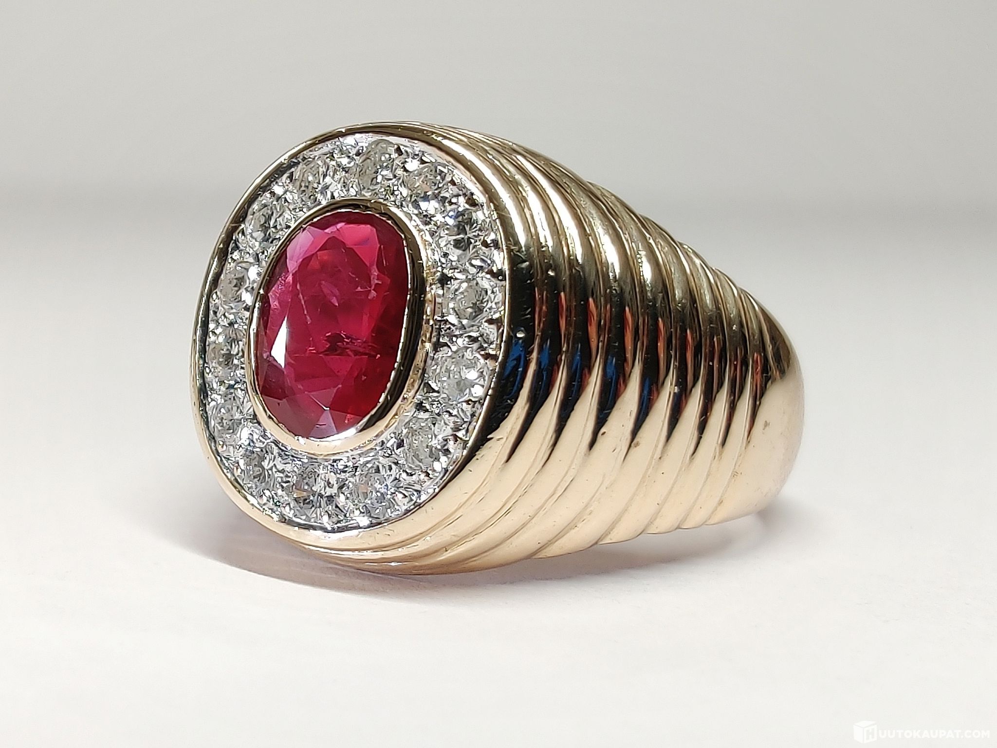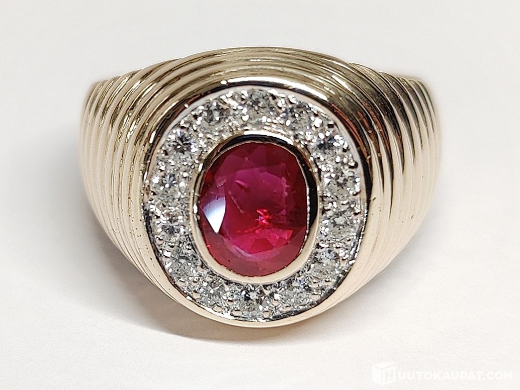 Todella komea rubiinikoristeinen timanttikantasormus 585 14k kultaa.