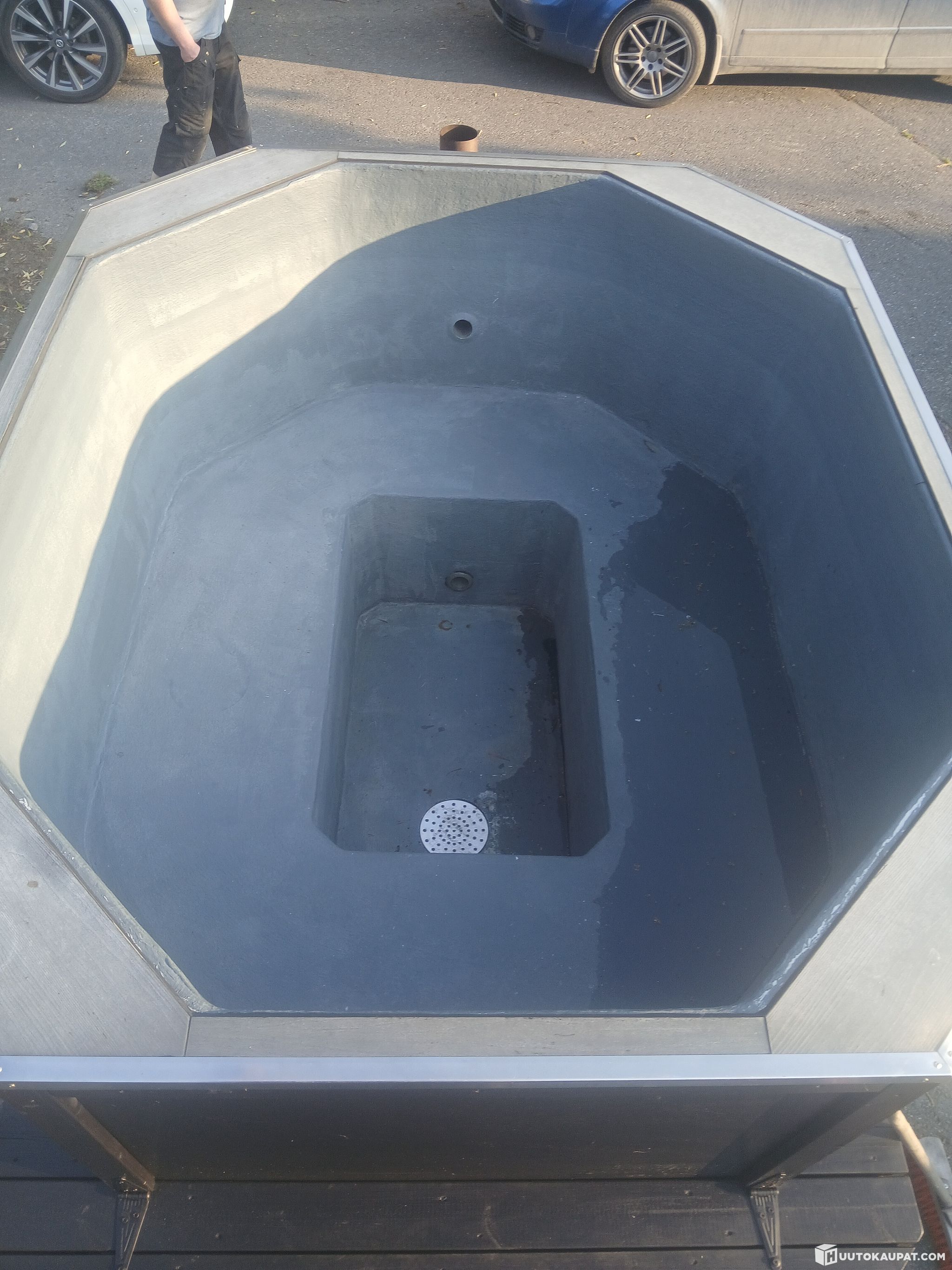 Allas omavalmisteista lasikuitua. Ollut ennen kärryä pihapaljuna. Eristetty ympäri asti, myös pohjasta. Noin pari vuotta sitten vuoti kaivon liitoksesta, massattiin tukkoon. Altaan yläreunassa vinyylilankku, nurkissa hyvät tasot esimerkiksi juomille. Ulkokulmassa 25x25mm RST listat.