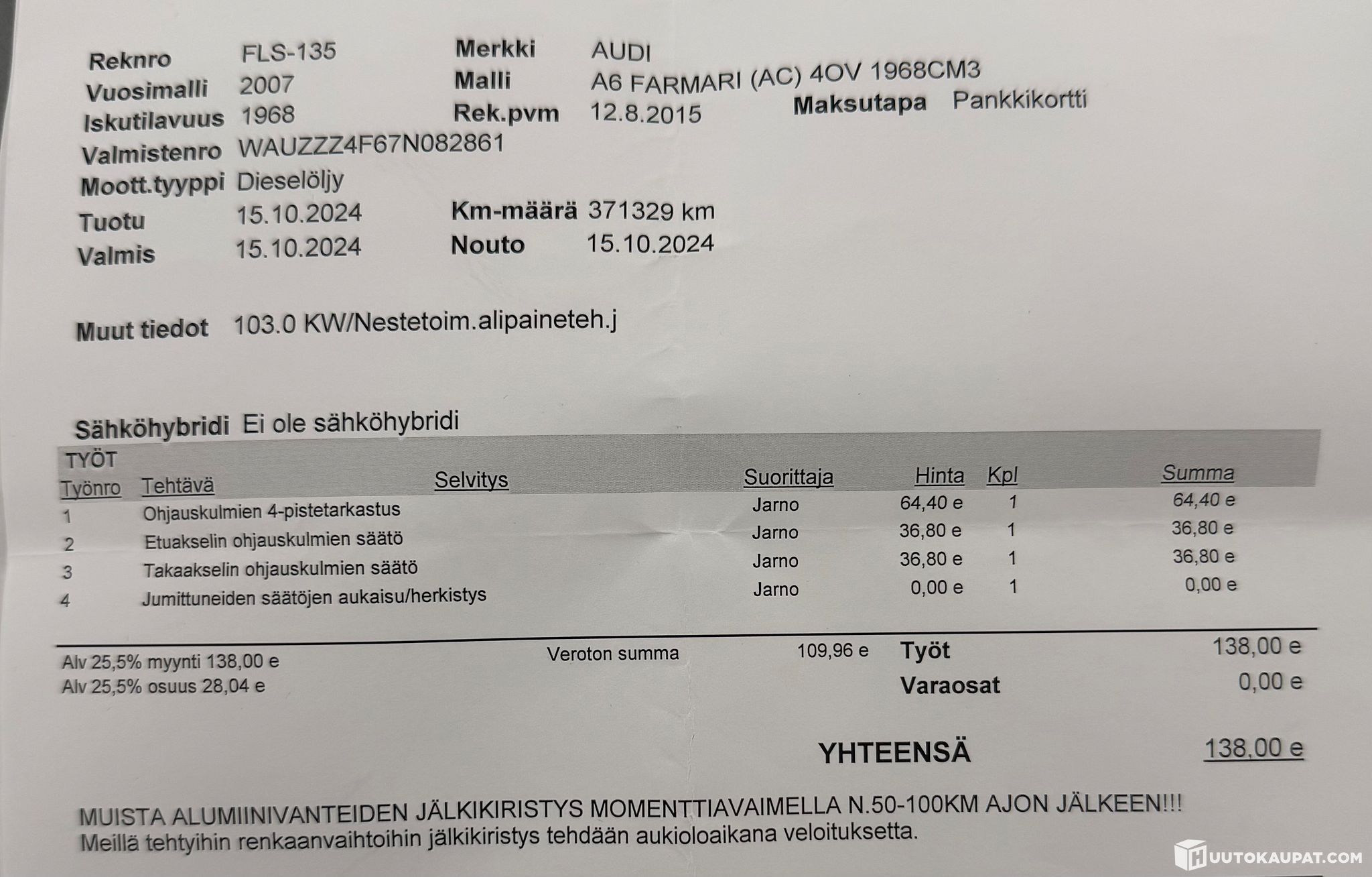 Tämän kohteen myyjä on Huutokaupat.com. Koiviston Autotalo Oy antaa Huutokaupat.comin puolesta kohteesta lisätietoja ja vastaa kohteen luovutuksesta. Kohde tulee aina maksaa Huutokaupat.com-sivustolla olevien verkkomaksupainikkeiden kautta tai Huutokaupat.comin laskulla. Jos kohdetta ei makseta Huutokaupat.comille, Huutokaupat.com ei hyväksy mitään vastuuta kaupasta.