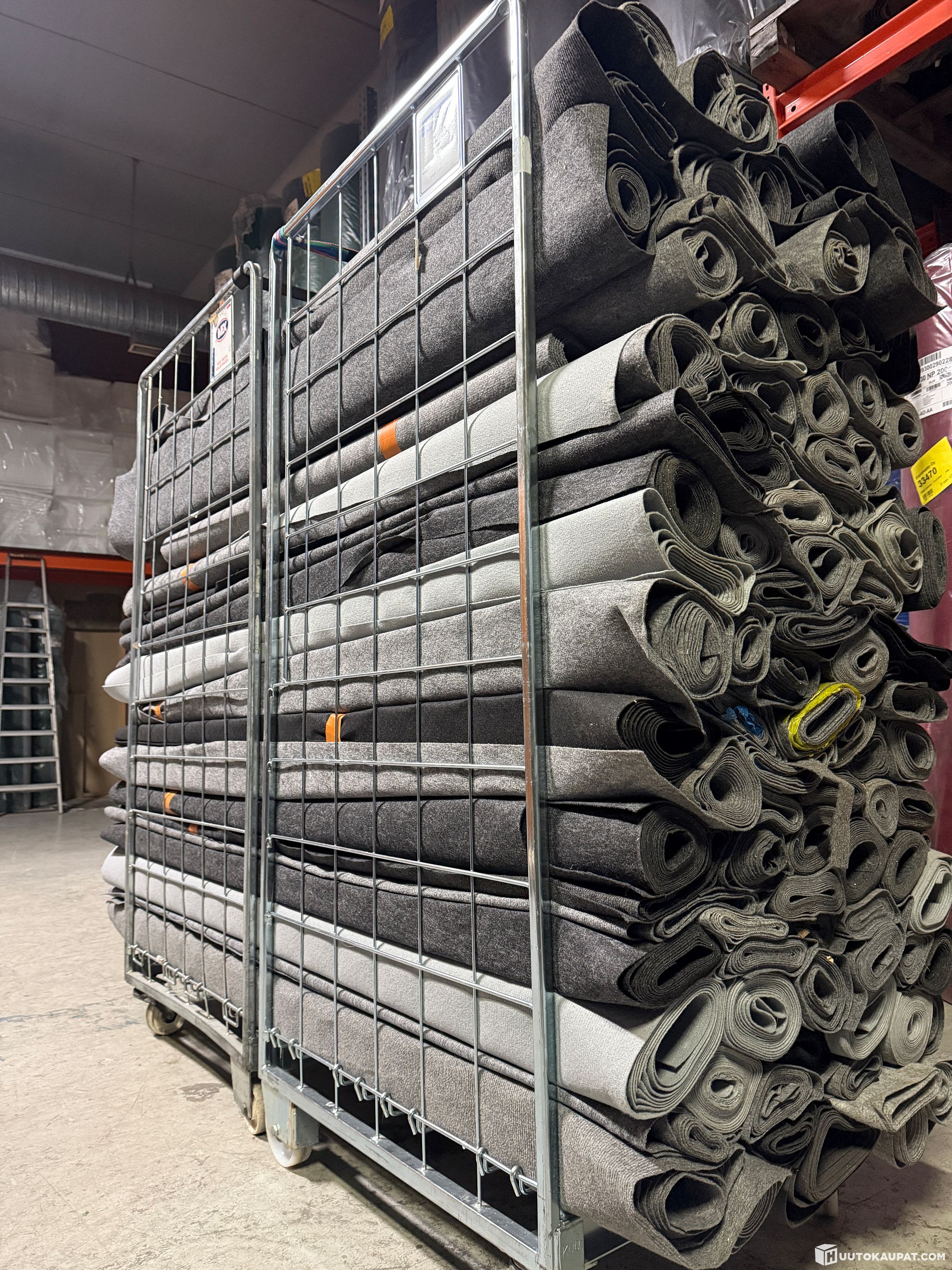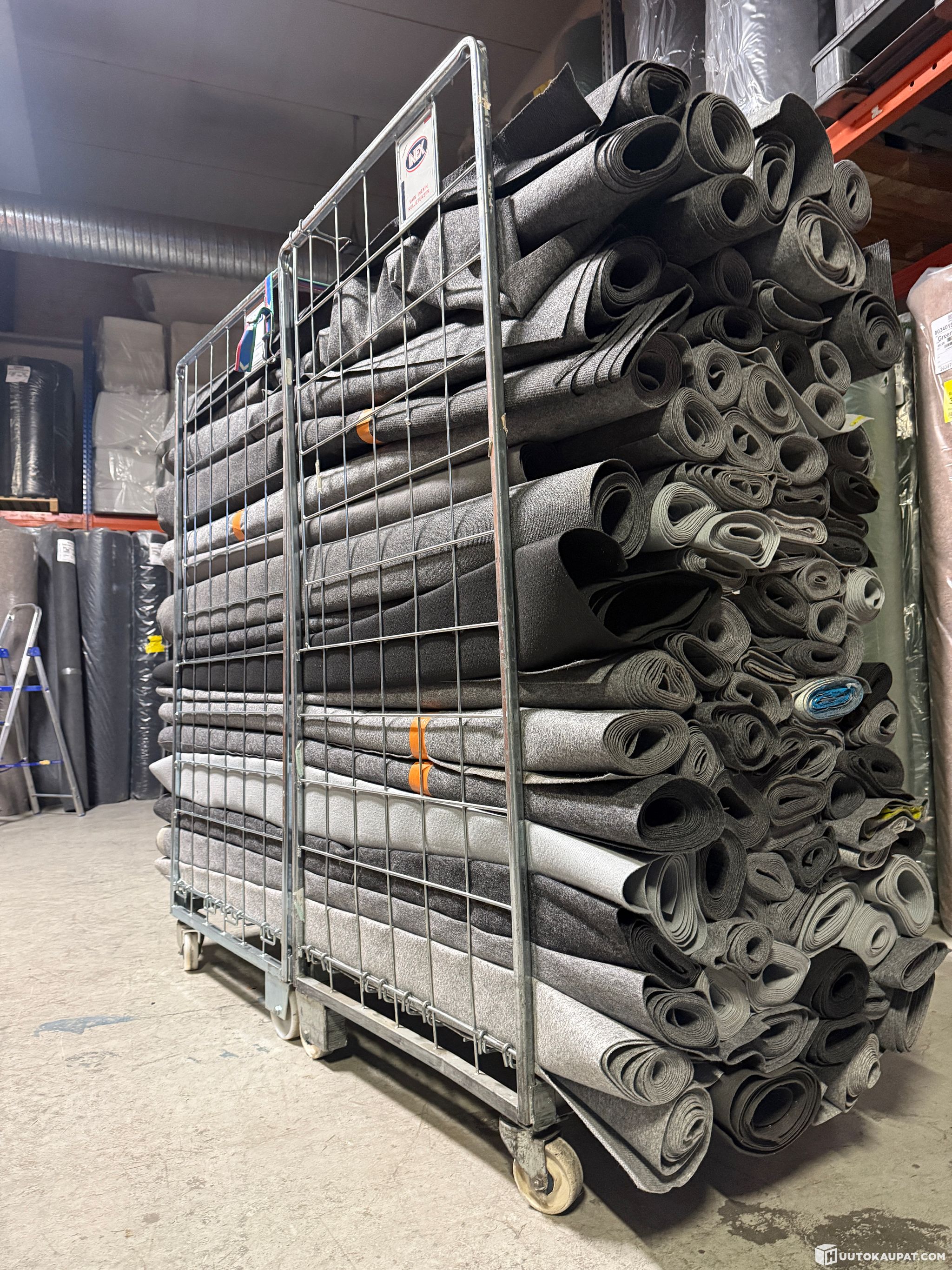 Tuplarullakollinen käytettyä harmaata messumattoa 2 metriä leveissä kaistaleissa.