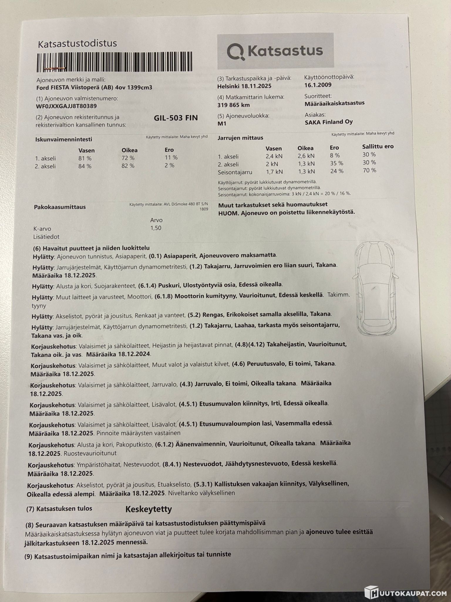 - Korjattavaksi tai varaosiksi, ks. havaitut viat
