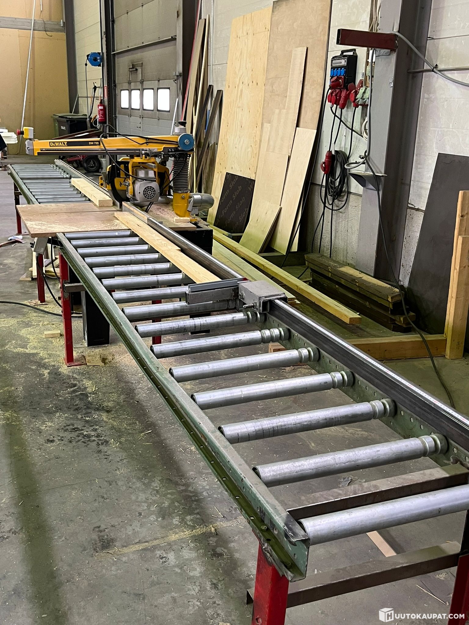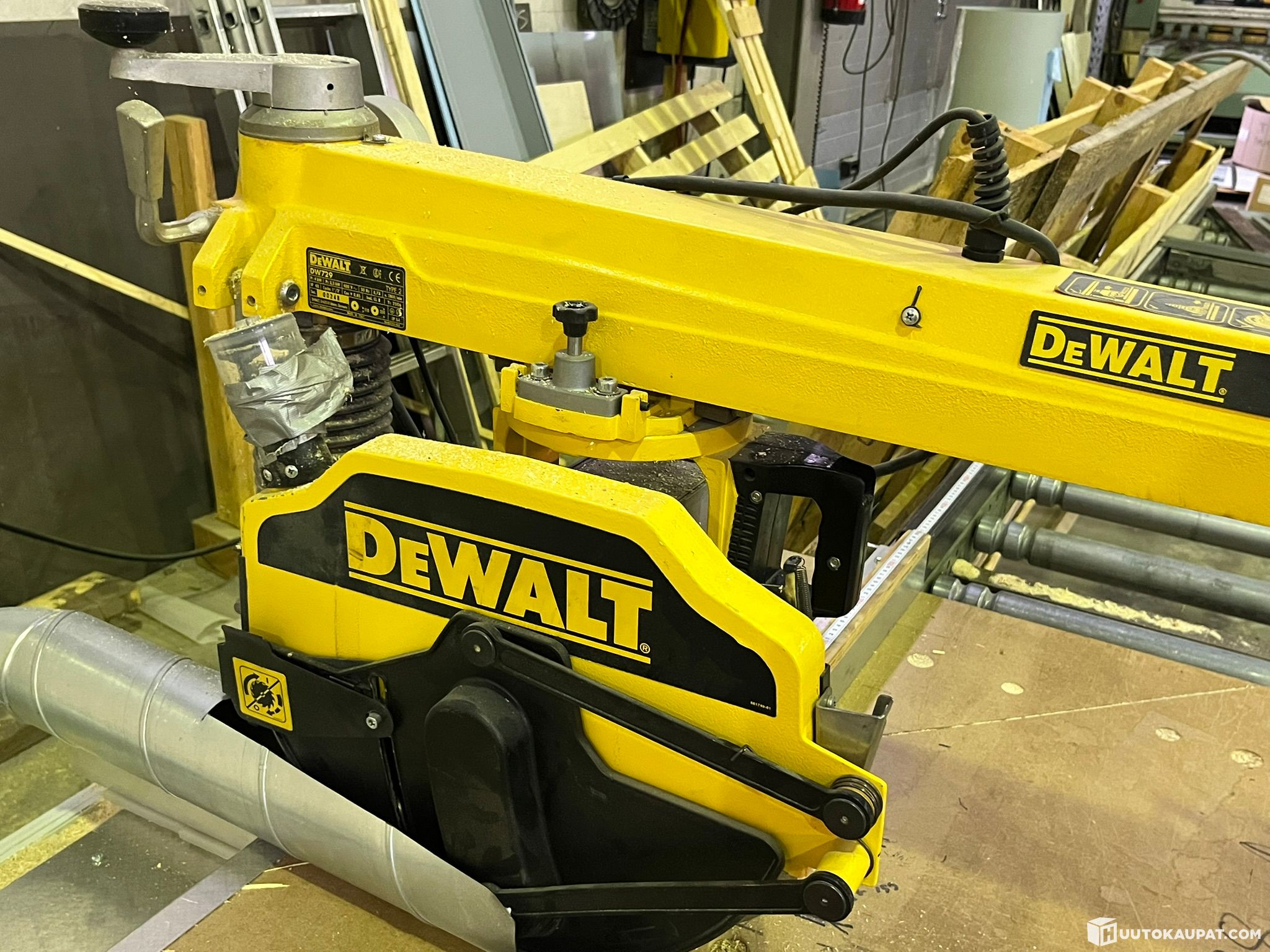 Toimiva, käytöstä poistettu DeWalt DW 729 katkaisusirkkeli ja rullaradat (kaappa, katkaisusaha, pyörösaha)