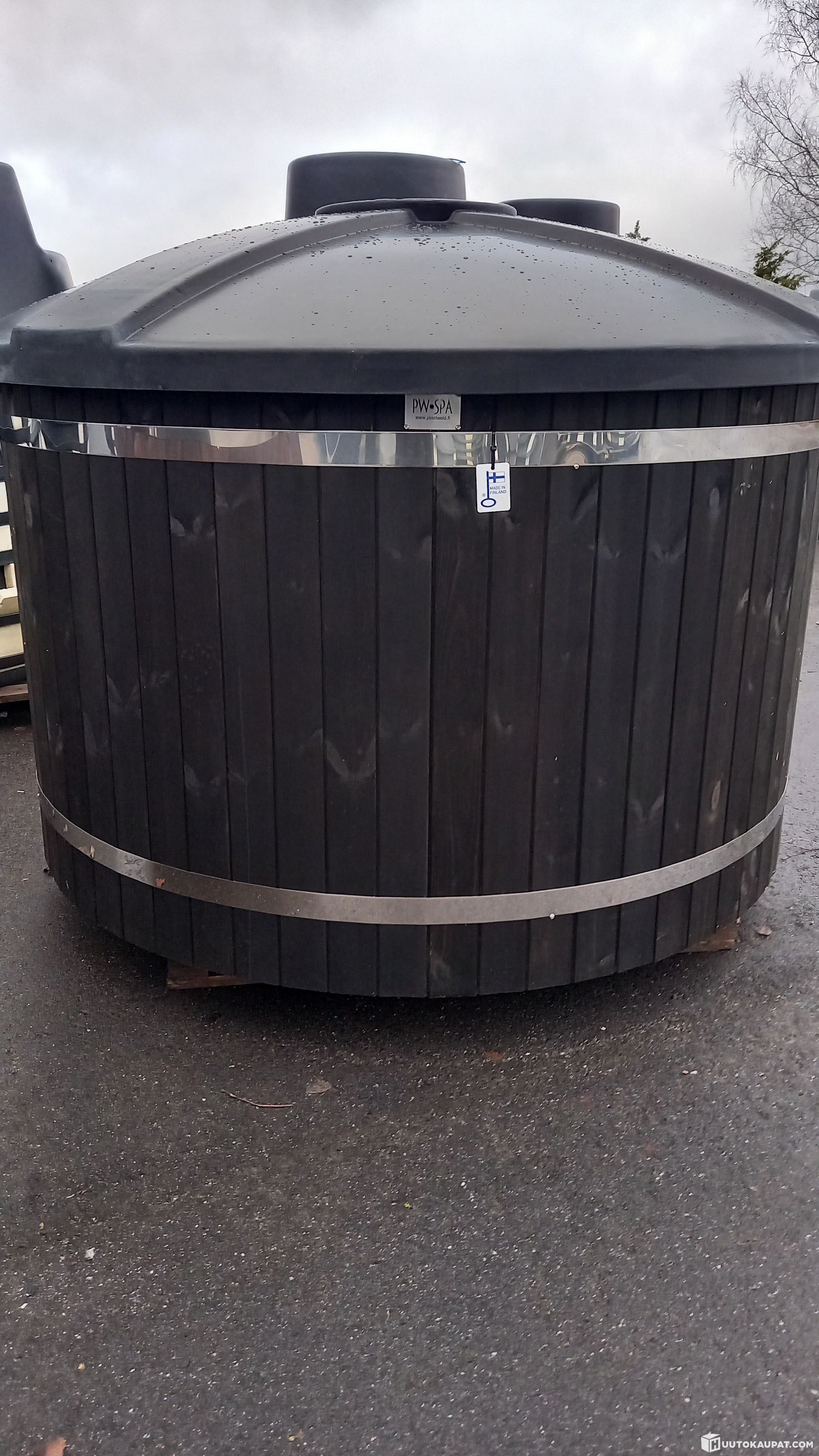Nyt huutokaupattava kylpytynnyri on kylpyvalmis paketti. Se on suunniteltu 6-8 hengelle ja on ulkohalkaisijaltaan noin Ø180 cm. Kylpytynnyripakettiin kuuluu vankka PE-muovinen kansi sekä merialumiininen kamiina piippuineen ja letkuineen.