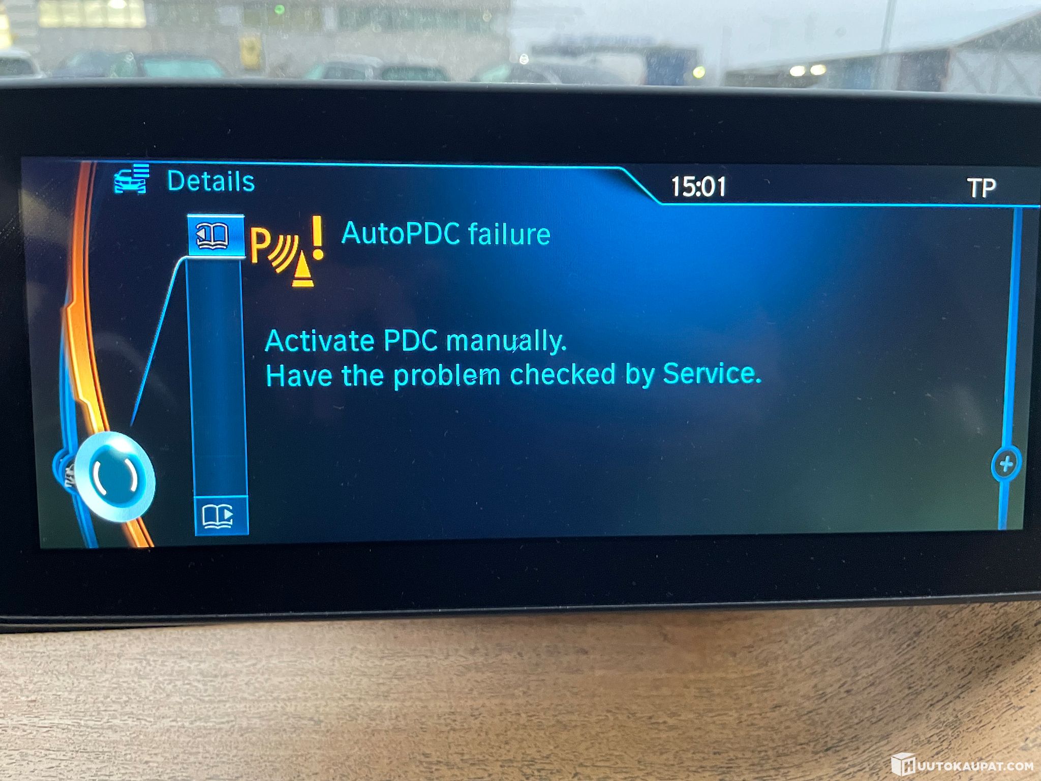 Käynnistäessä varoittaa "Auto PDC Failure - Activate PDC manually. Have the problem checked by service". PDC= Parking Distance Control. Tämä voi johtua viallisesta sensorista, kosteuden tai fyysisen vian johdosta. Ratkeaa yleensä viallisen sensorin vaihdolla.