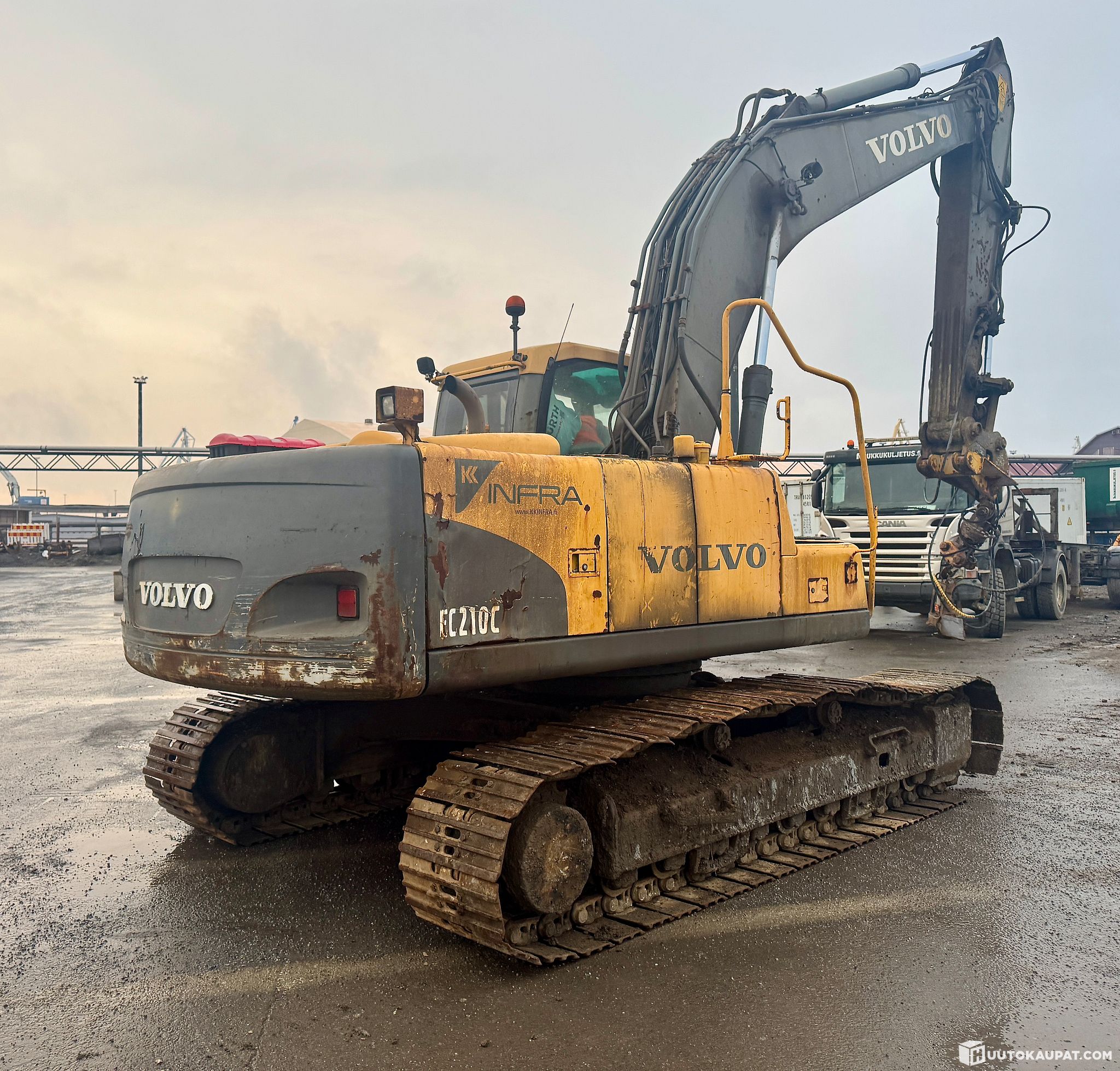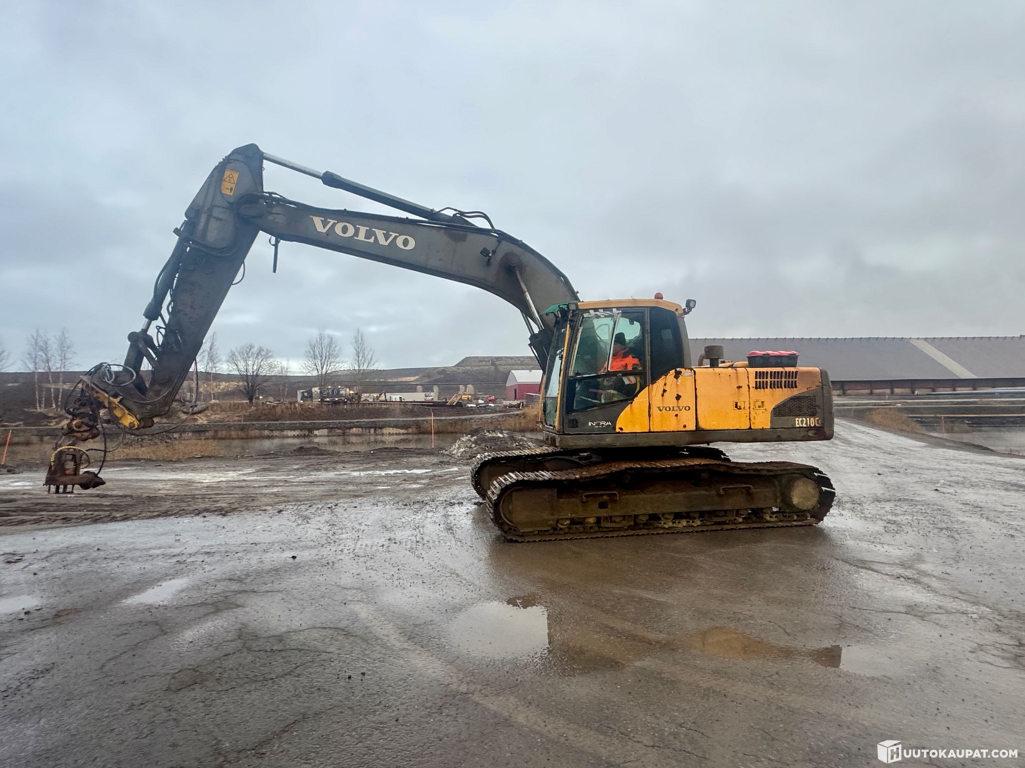 Volvo EC 210 C kaivinkone, ntp-10 liittimellä. Moottori käy nätisti ja pumput toimii, telasto ja ulkokuori elämää nähneitä. Vetomoottori vuotaa ja kääntökehä vuotaa öljyä.