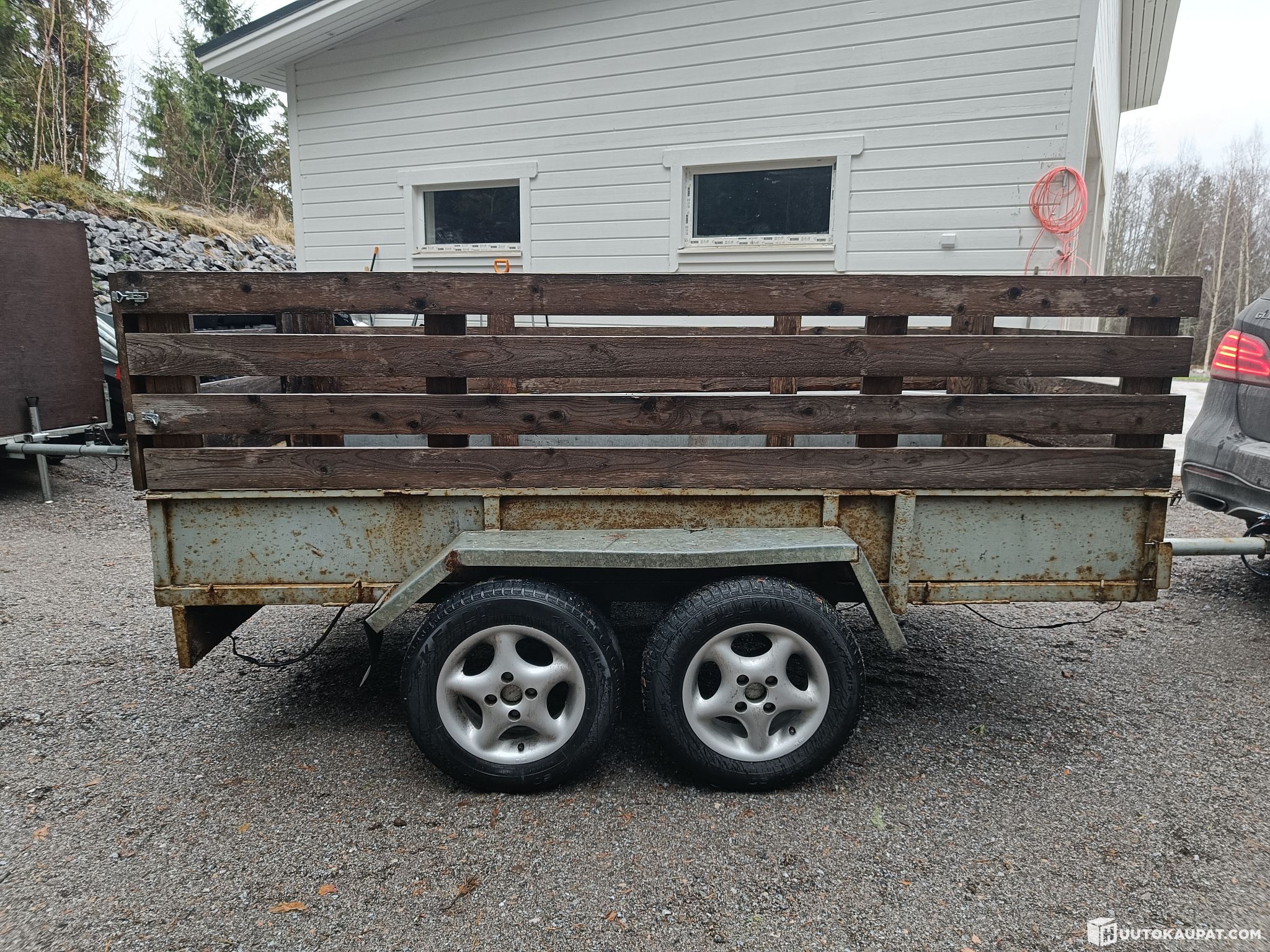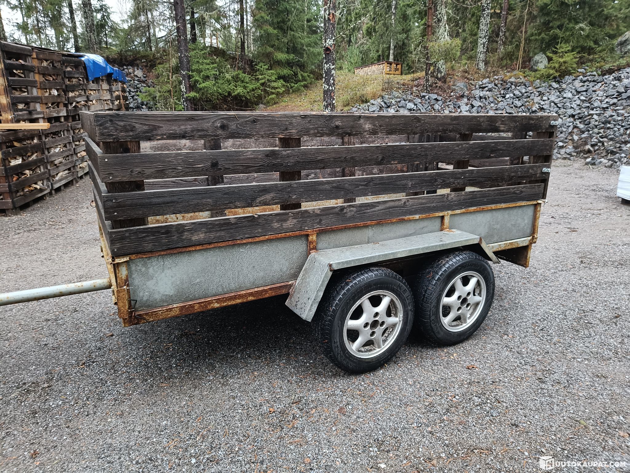 Kärry joka ei käytetä meillä myydään seuraavalle. Puukehys voi nostaa pois käsin mikäli sille ei ole käyttöä. Molemmat akselit kärryn alla ovat uudet motonetista hankittuja.