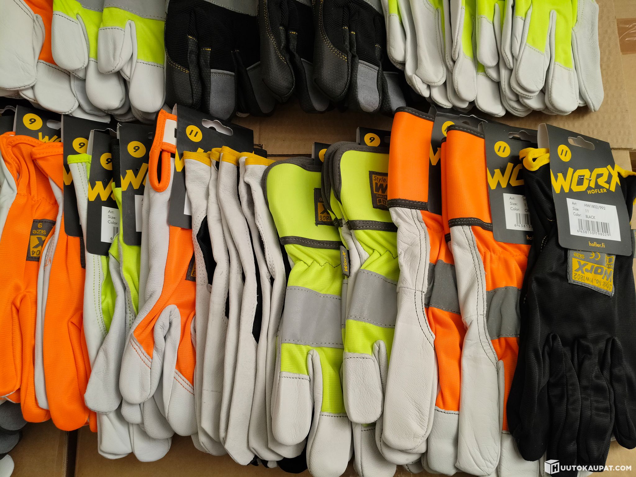 Mukana sekä kevyempiä työ/käsittelyhanskoja että vahvempia turvahanskoja heijastinnauhoilla sekä paksumpaa talvimallia.