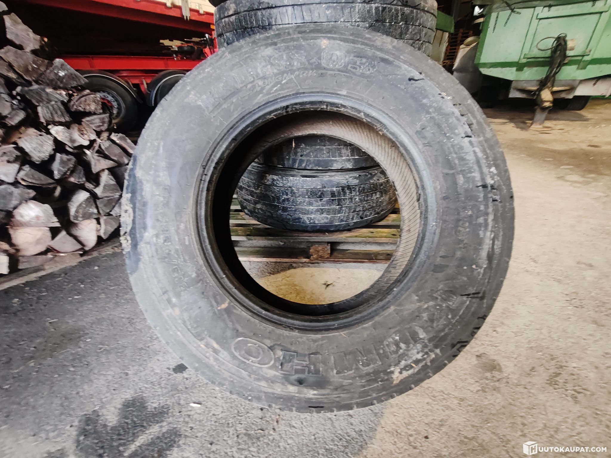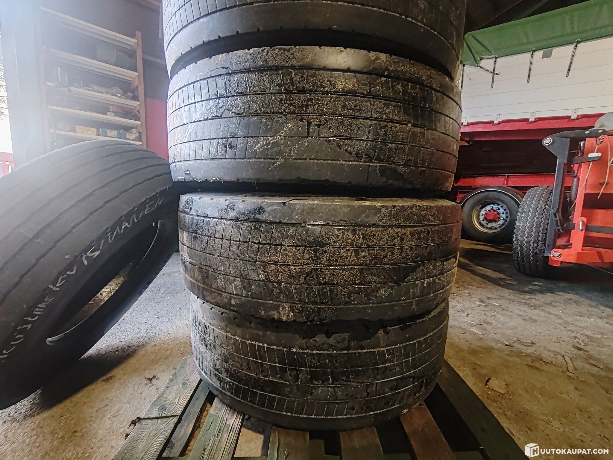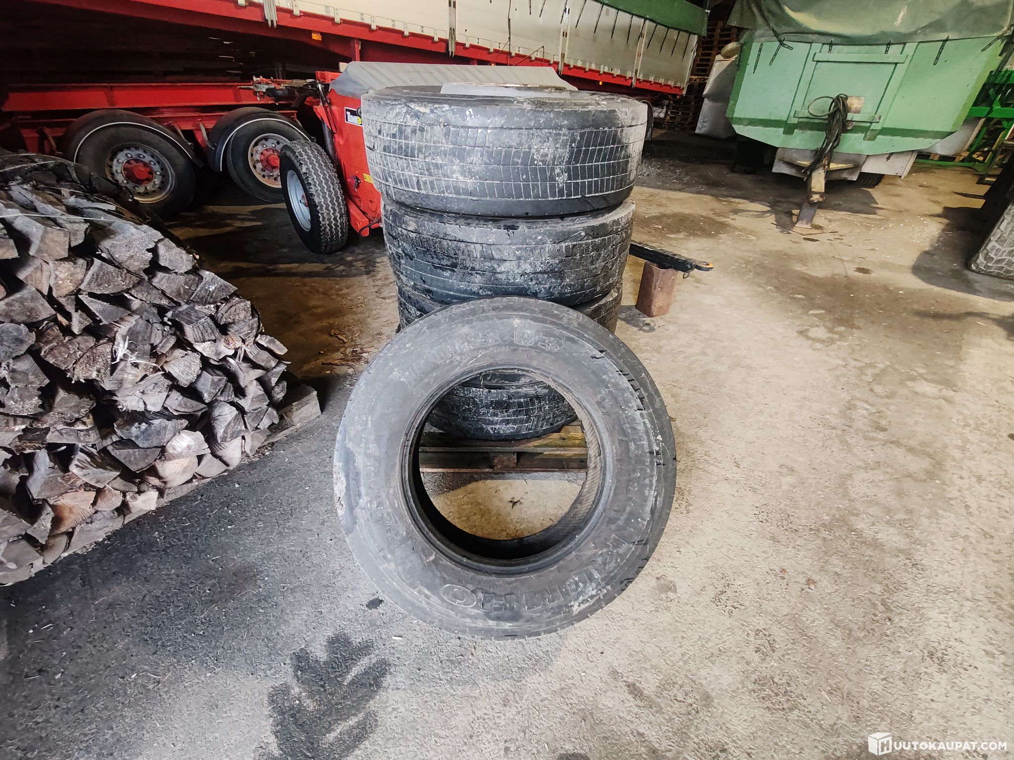 Huutokaupataan kuvissa näkyvät 4kpl Continental 315/70R22,5 renkaita vanteineen, sekä 1kpl Kumho 315/70R22,5 ilman vannetta.