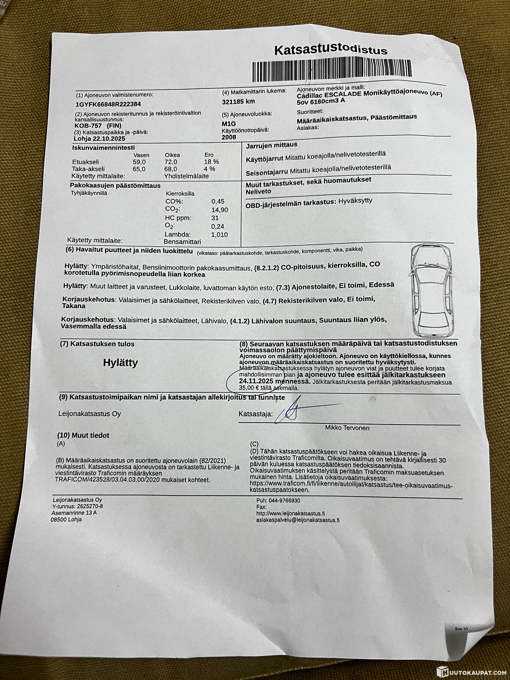 -Hylätty katsastuksessa, vikalista kuvissa.