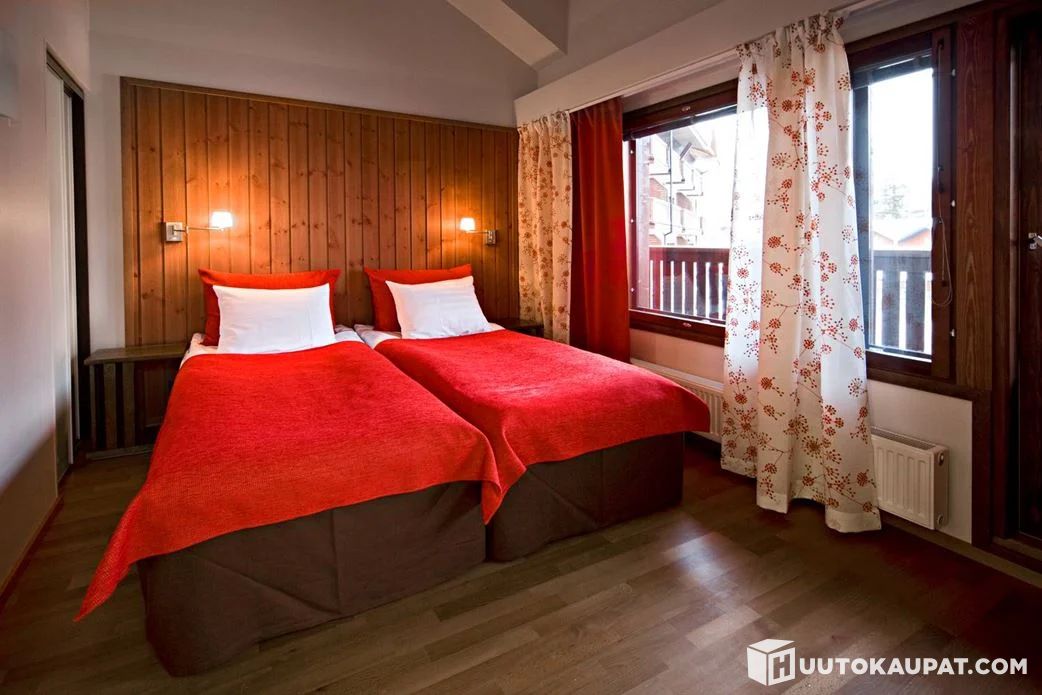 Vuodepaikat neljälle makuuhuoneissa sekä levitettävä vuodesohva lisävuoteena kahdelle olohuoneessa