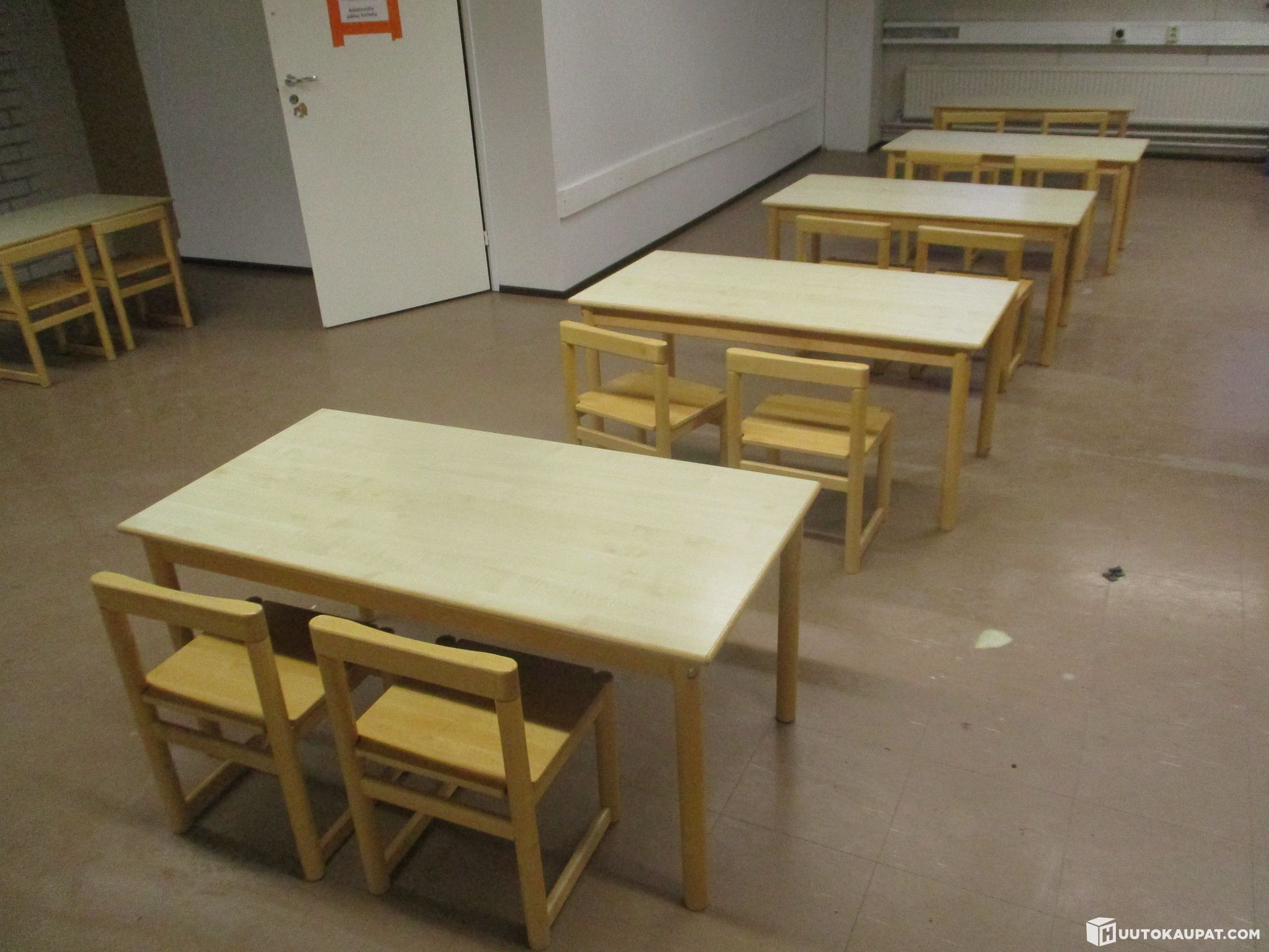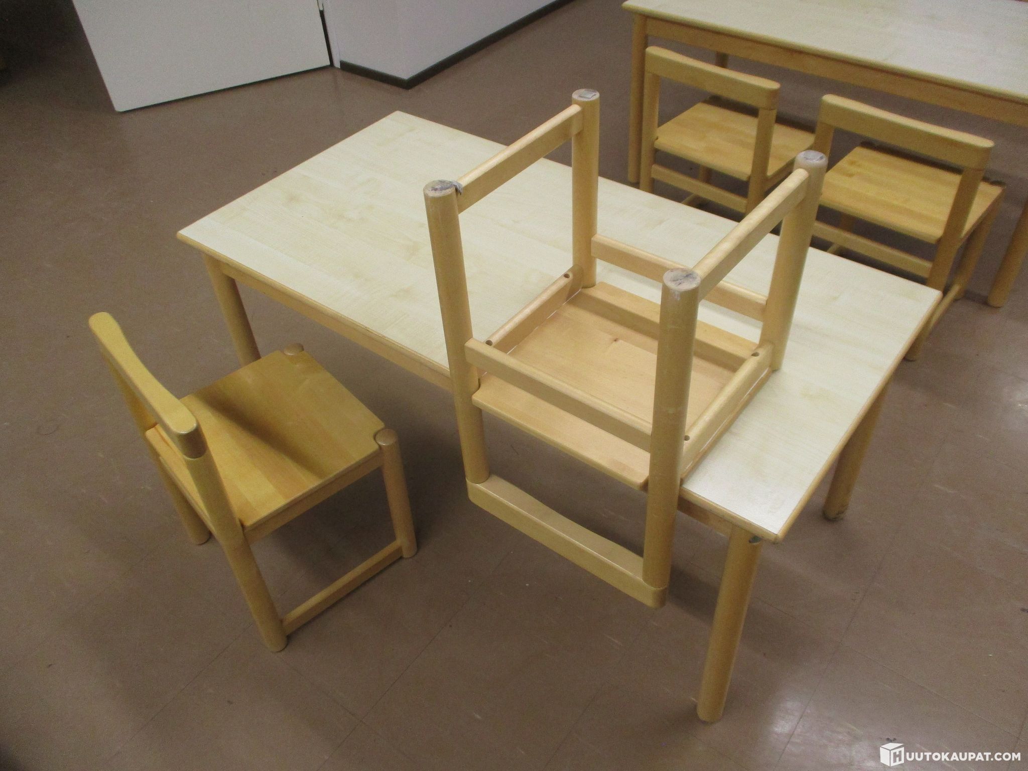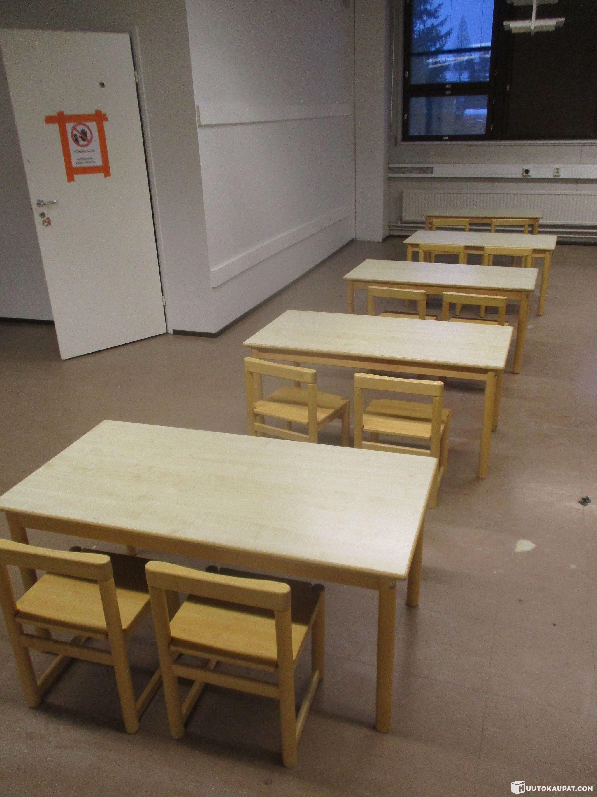 Pienille lapsille sopivat viisi pöytää ja kymmenen tuolia. Olleet päiväkodissa käytössä, poistetaan tarpeettomina. Kunto käytetty mutta täysin toimiva. Samaa sarjaa myynnissä useampikin erä.