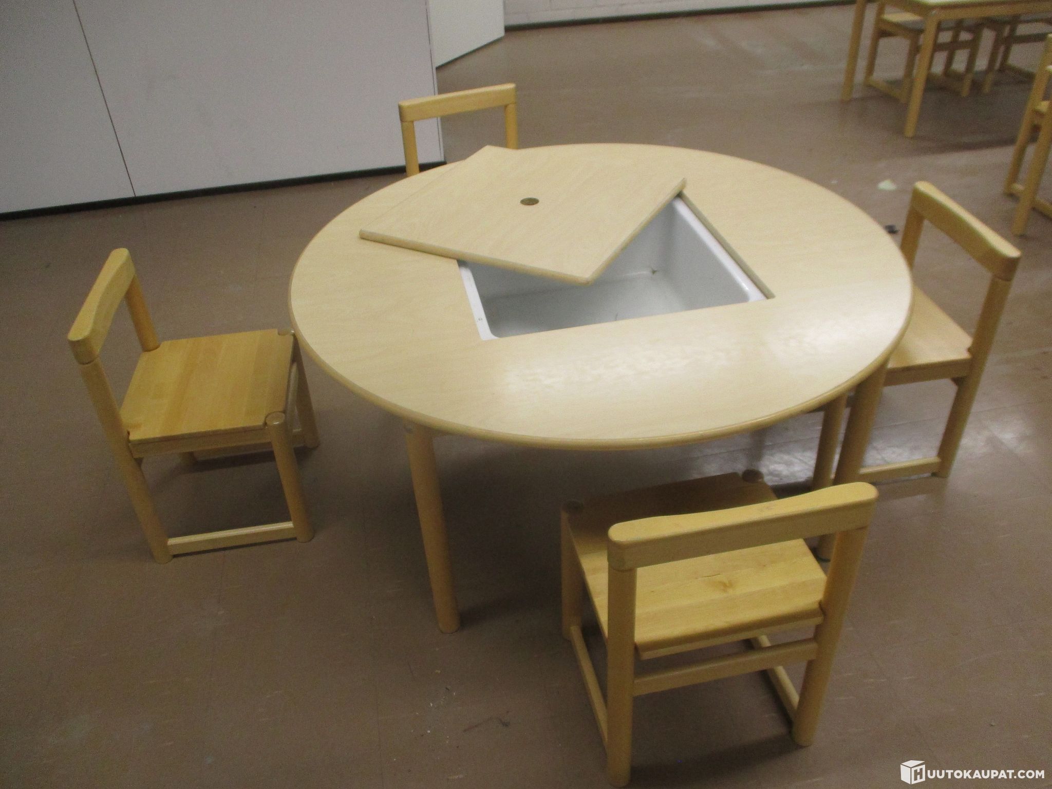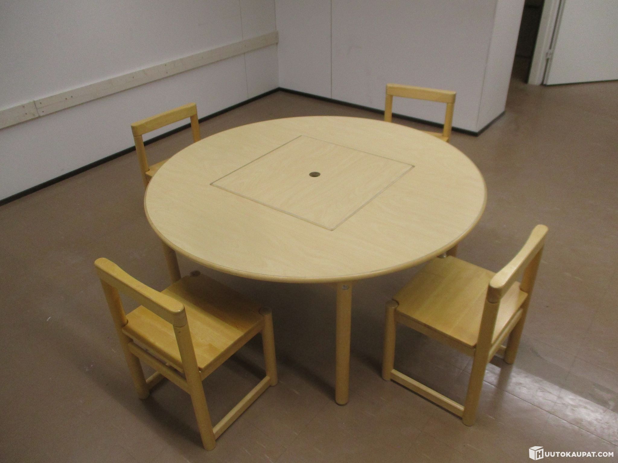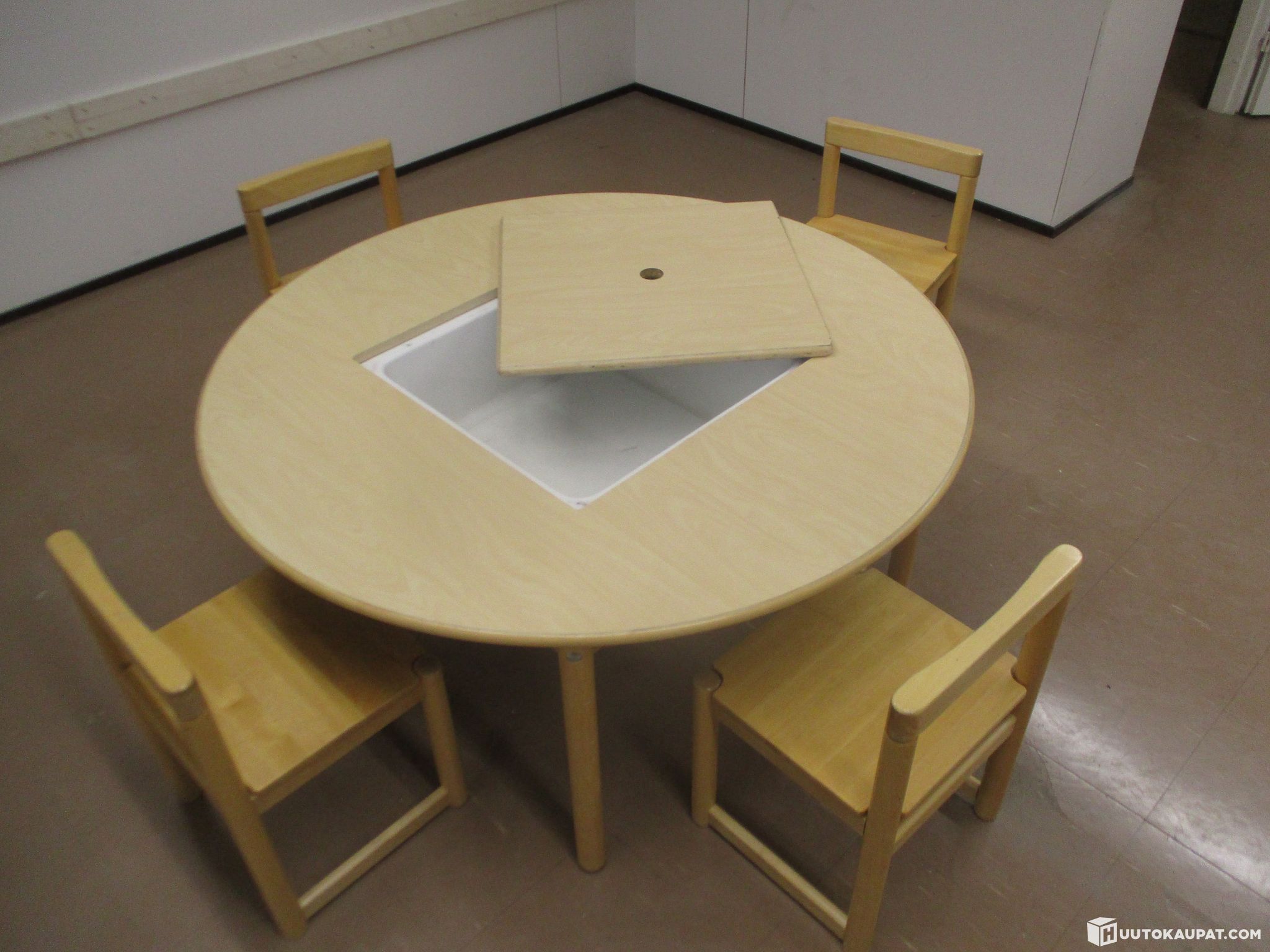 Pienille lapsille sopiva pyöreä askartelu/leikkipöytä ja neljä tuolia. Olleet päiväkodissa käytössä, poistetaan tarpeettomina. Kunto käytetty mutta täysin toimiva. Samaa sarjaa myynnissä useampikin erä.
