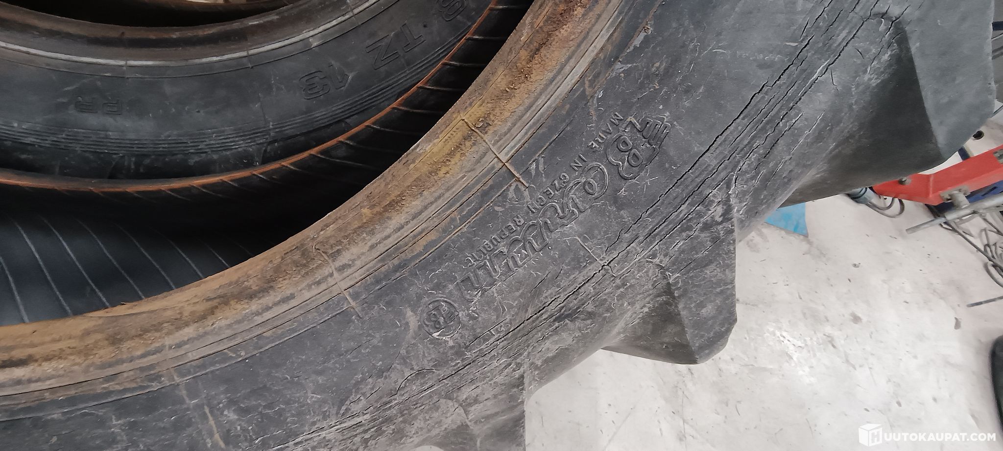 Myynnissä kuvien renkaat. (2kpl). Purettu ehjänä, kyljissä halkeamiana mutta päivä ei paista lävitse. Hyvät renkaat vielä pihakoneeseen pieniin ajoihin.