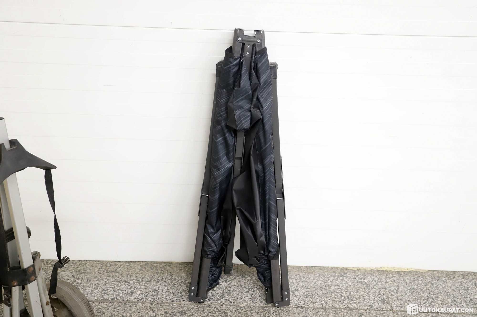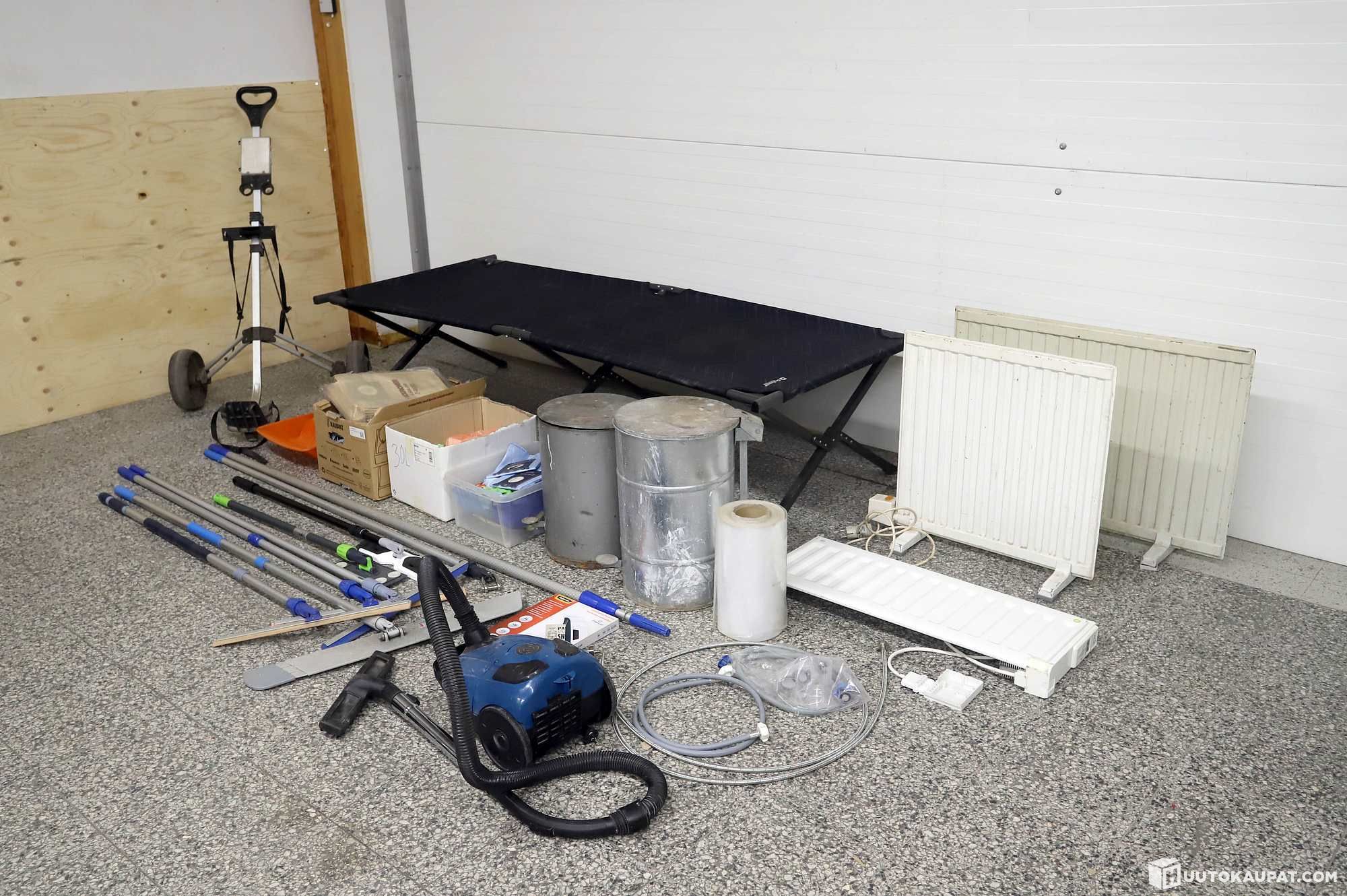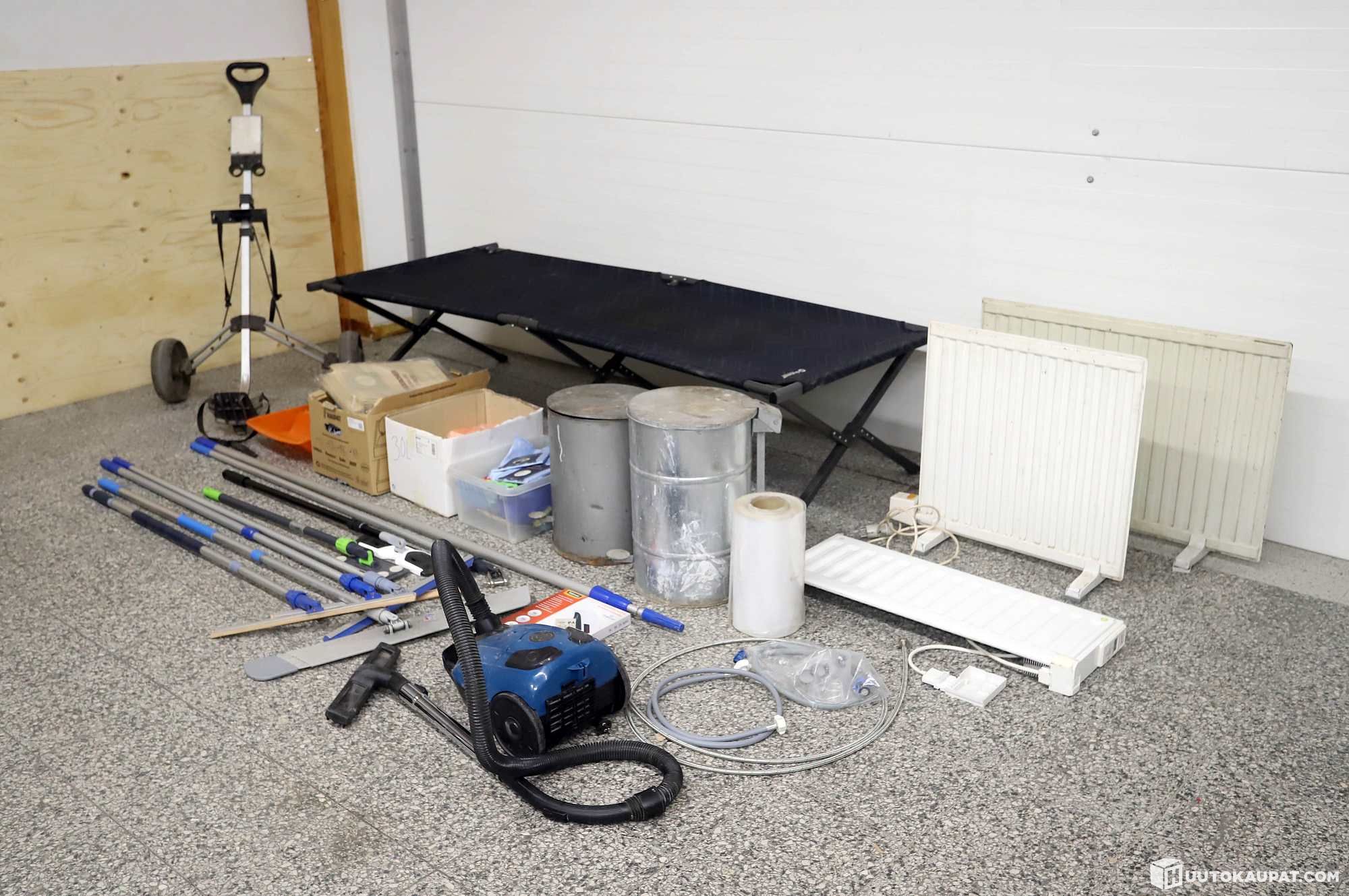Erä siivoustarvikkeita, pattereita, retkisänky, yms.