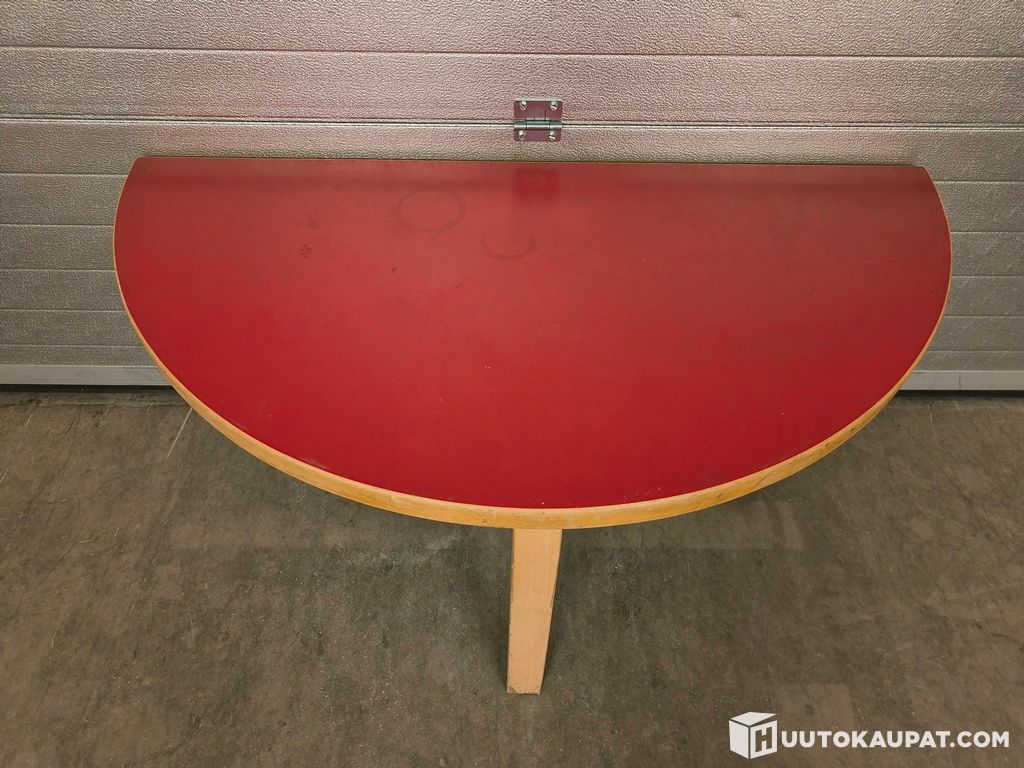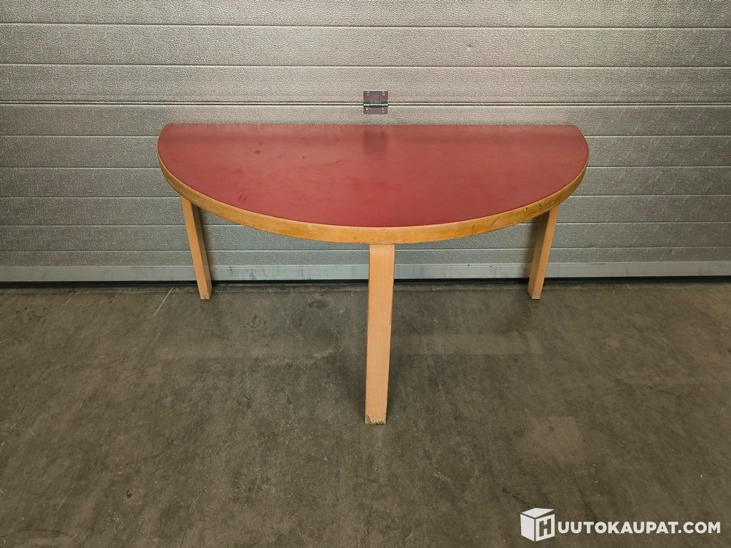 Artekin klassinen puoliympyrän muotoinen pöytä, joka on suunniteltu sijoitettavaksi seinää vasten. Pöydässä on punainen linoleum-kansi ja vaalea koivurakenne.