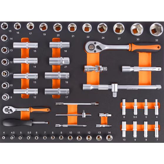 • 17 kpl ½" hylsyä 9, 10, 11, 12, 13, 14, 15, 16, 17, 19, 20, 21, 22, 24, 27, 30 ja 32 mm