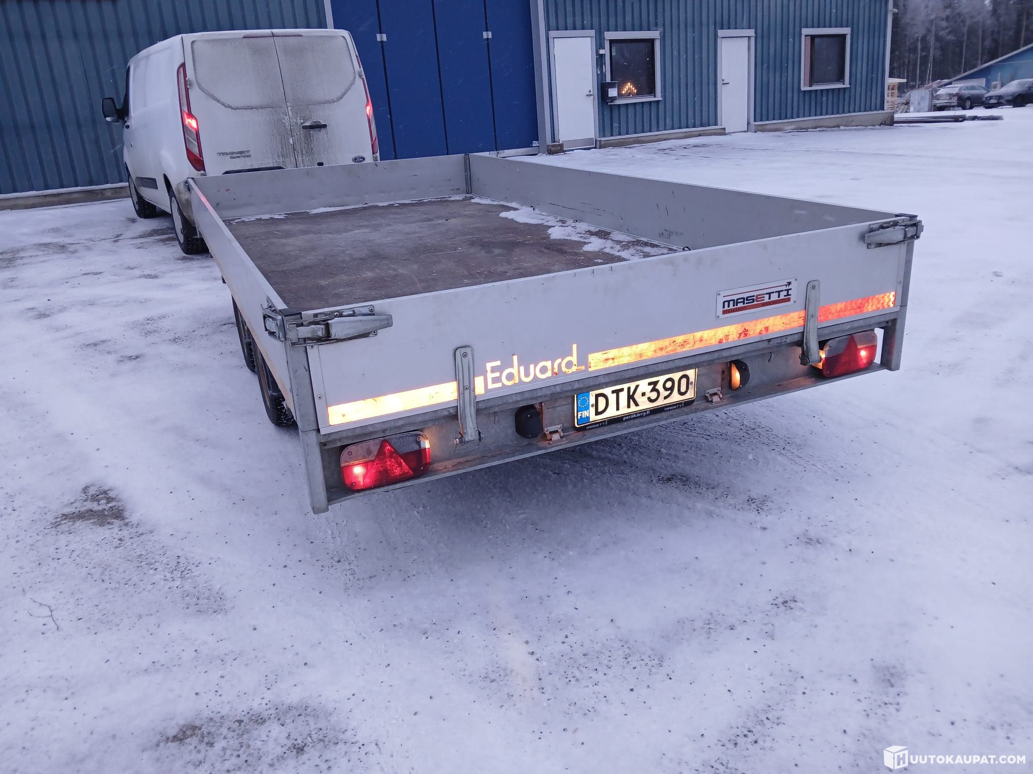 Eduard tavaran/autonkuljetus perävaunu. Kokonaismassa 2700kg ja omamassa 658kg. Lava 2x4m, aukeavilla laidoilla ja ajorampeilla (rekisterikilven alla). Tukijaloilla.